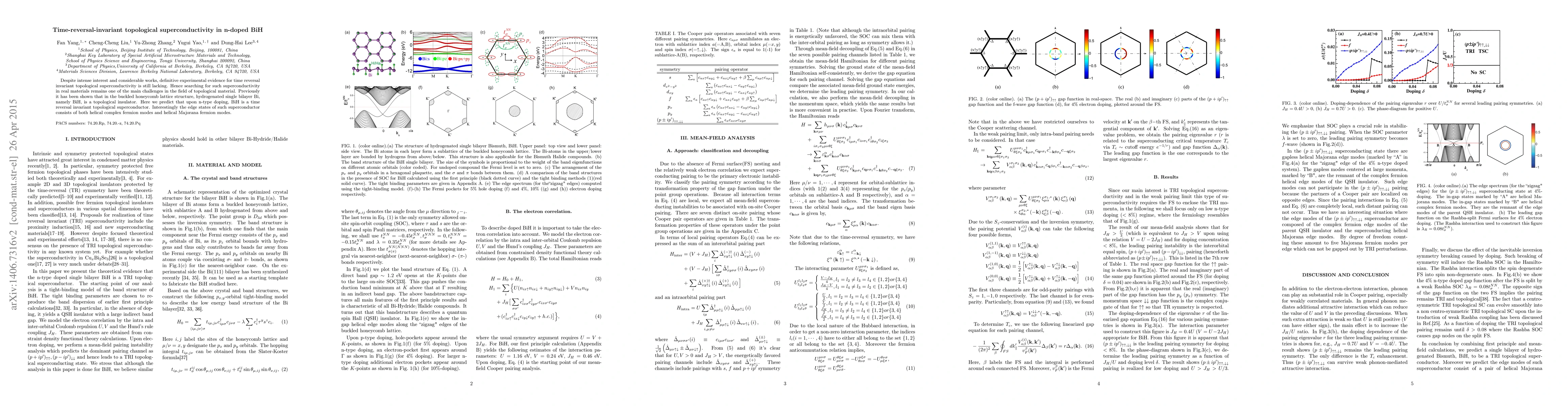 The paper proposes that electron-doped hydrogenated bismuth (BiH) may exhibit time-reversal-invariant topological superconductivity, potentially becoming the first confirmed example of such a state. Experimental verification is needed to substantiate this theoretical prediction.