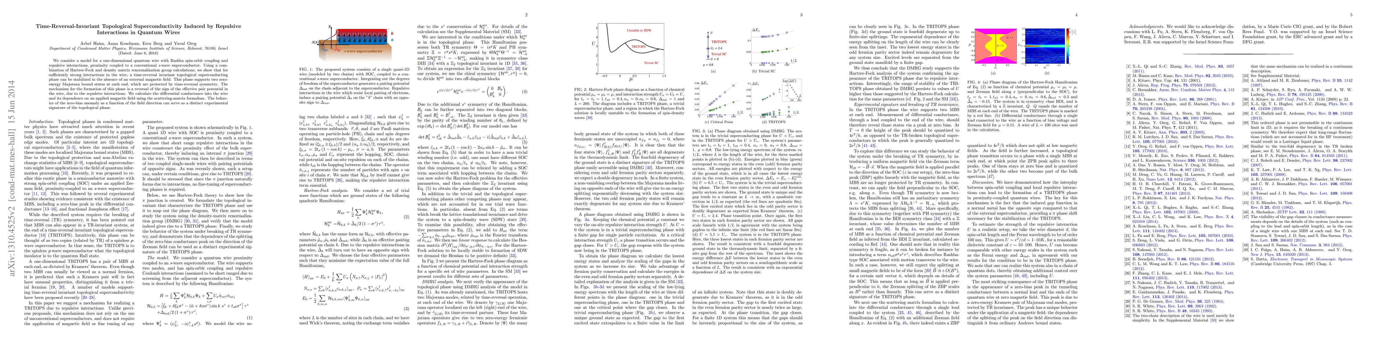 We consider a model for a one-dimensional quantum wire with Rashba spin-orbit coupling and repulsive interactions, proximity coupled to a conventional s-wave superconductor. Using a combination of Hartree-Fock and density matrix renormalization group calculations, we show that for sufficiently strong interactions in the wire, a time-reversal invariant topological superconducting phase can be stabilized in the absence of an external magnetic field. This phase supports two zero-energy Majorana bound states at each end, which are protected by time-reversal symmetry. The mechanism for the formation of this phase is a reversal of the sign of the effective pair potential in the wire, due to the repulsive interactions. We calculate the differential conductance into the wire and its dependence on an applied magnetic field using the scattering-matrix formalism. The behavior of the zero-bias anomaly as a function of the field direction can serve as a distinct experimental signature of the topological phase.