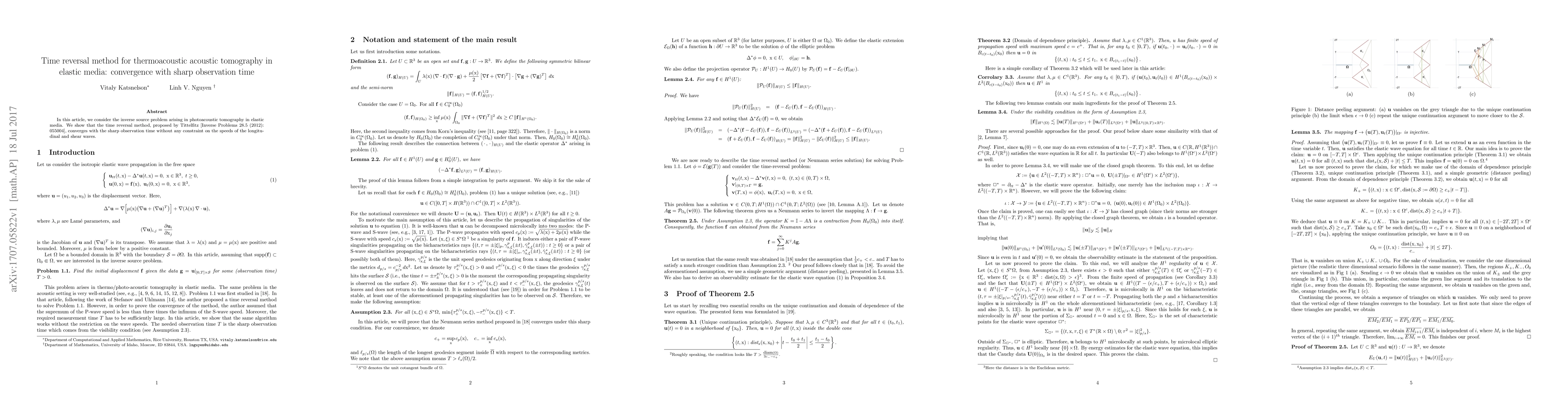 In this article, we consider the inverse source problem arising in photoacoustic tomography in elastic media. We show that the time reversal method, proposed by Tittelfitz [Inverse Problems 28.5 (2012): 055004], converges with the sharp observation time without any constraint on the speeds of the longitudinal and shear waves.