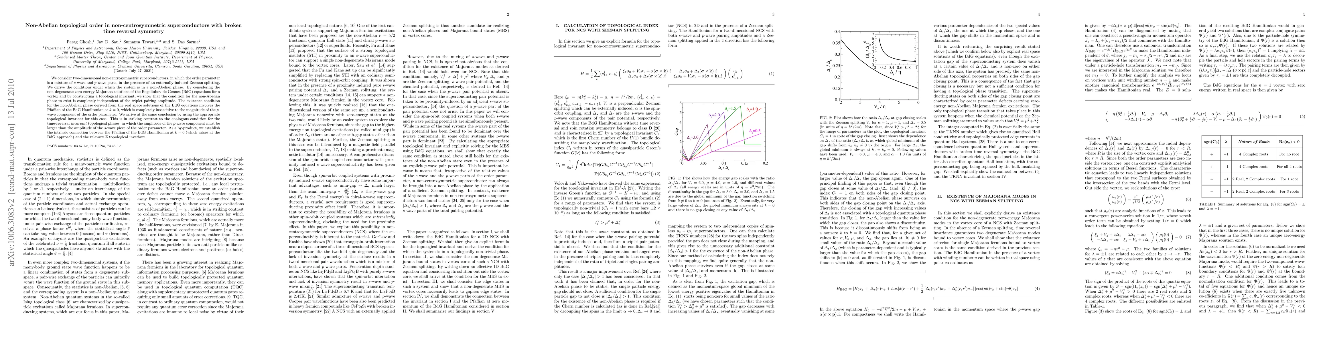 We consider two-dimensional non-centrosymmetric superconductors, where the order parameter is a mixture of s-wave and p-wave parts, in the presence of an externally induced Zeeman splitting. We derive the conditions under which the system is in a non-Abelian phase. By considering the non-degenerate zero-energy Majorana solutions of the Bogoliubov-de Gennes (BdG) equations for a vortex and by constructing a topological invariant, we show that the condition for the non-Abelian phase to exist is completely independent of the triplet pairing amplitude. The existence condition for the non-Abelian phase derived from the real space solutions of the BdG equations involves the Pfaffian of the BdG Hamiltonian at k = 0, which is completely insensitive to the magnitude of the p-wave component of the order parameter. We arrive at the same conclusion by using the appropriate topological invariant for this case. This is in striking contrast to the analogous condition for the time-reversal invariant topological phases, in which the amplitude of the p-wave component must be larger than the amplitude of the s-wave piece of the order parameter. As a by-product, we establish the intrinsic connection between the Pfaffian of the BdG Hamiltonian at k = 0 (which arises at the BdG approach) and the relevant Z topological invariant.