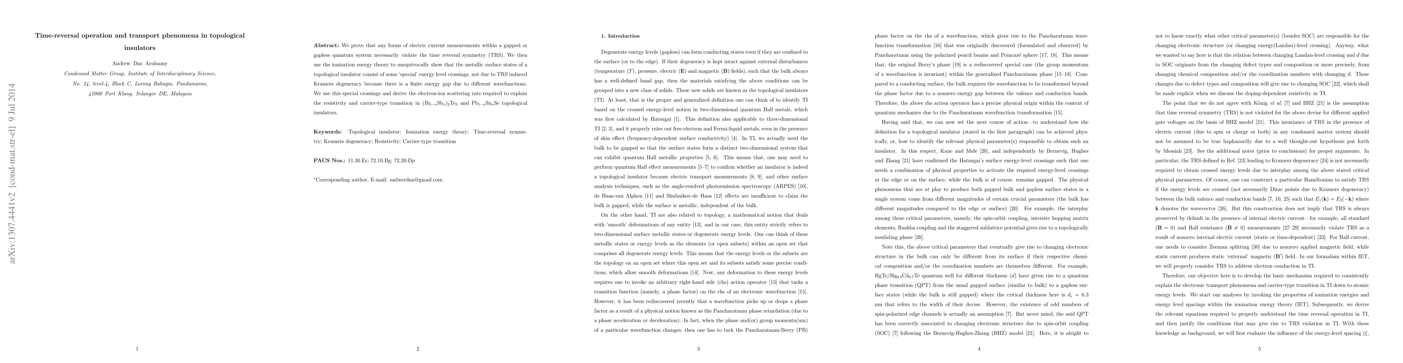 We prove that any forms of electric current measurements within a gapped or gapless quantum system necessarily violate the time reversal symmetry (TRS). We then use the ionization energy theory to unequivocally show that the metallic surface states of a topological insulator consist of some special energy level crossings, not due to TRS induced Kramers degeneracy because there is a finite energy gap due to different wavefunctions. We use this special crossings and derive the electron-ion scattering rate required to explain the resistivity and carrier-type transition in (Bi1-xSbx)2Te3 and Pb1-xSnxSe topological insulators.