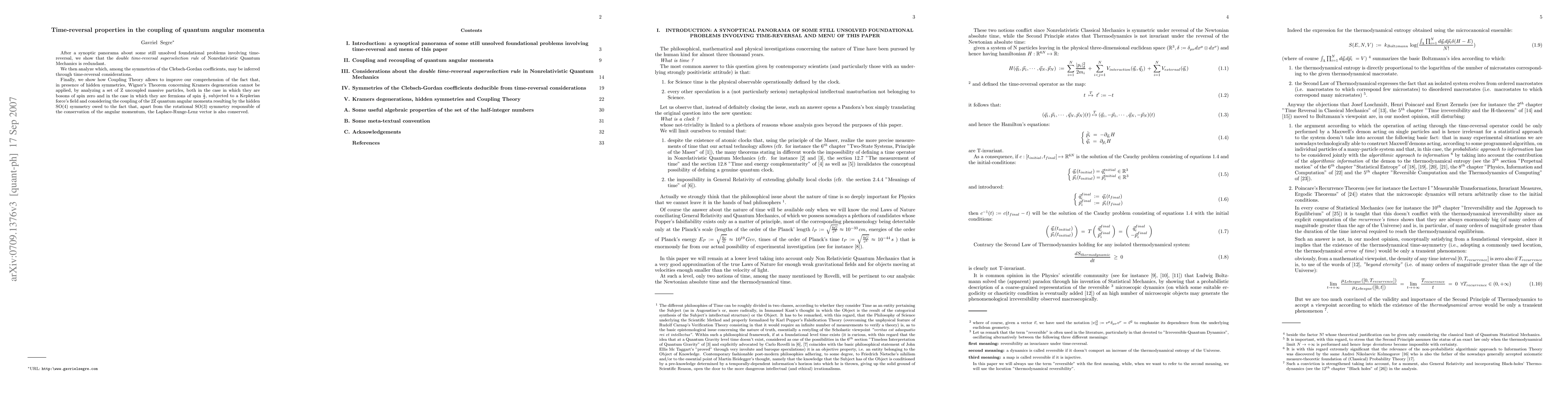After a synoptic panorama about some still unsolved foundational problems involving time-reversal, we show that the \emph{double time-reversal superselection rule} of Nonrelativistic Quantum Mechanics is redundant. We then analyze which, among the symmetries of the Clebsch-Gordan coefficients, may be inferred through time-reversal considerations. Finally, we show how Coupling Theory allows to improve our comprehension of the fact that, in presence of hidden symmetries, Wigner's Theorem concerning Kramers degeneration cannot be applied, by analyzing a set of Z uncoupled massive particles, both in the case in which they are bosons of spin zero and in the case in which they are fermions of spin 1/2, subjected to a Keplerian force's field and considering the coupling of the 2Z quantum angular momenta resulting by the hidden SO(4) symmetry owed to the fact that, apart from the rotational SO(3) symmetry responsible of the conservation of the angular momentum, the Laplace-Runge-Lenz vector is also conserved.