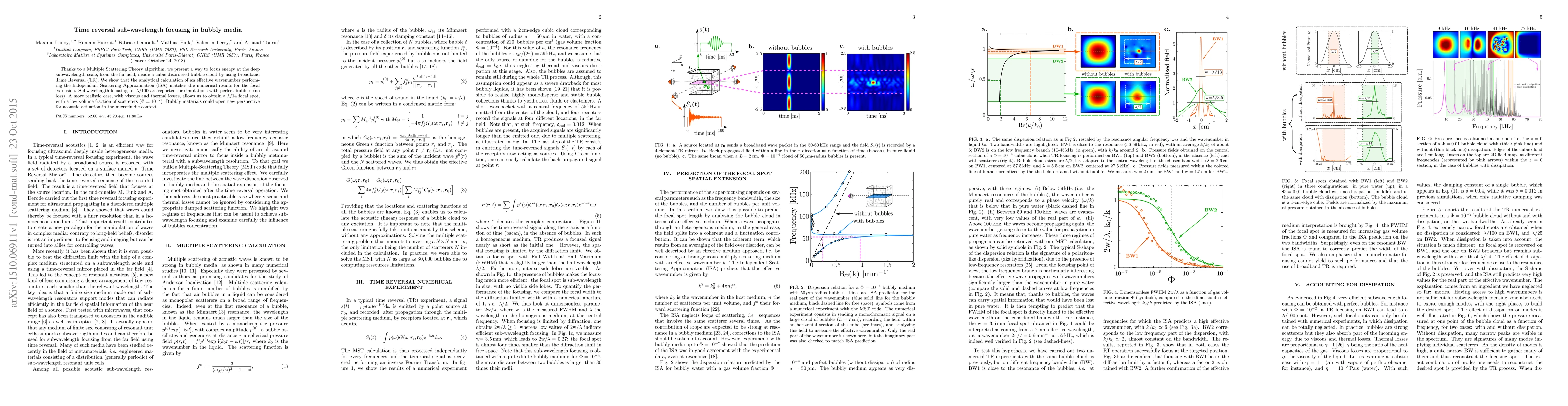 This paper introduces a method using Time Reversal (TR) and Multiple Scattering Theory to focus energy at deep subwavelength scales within disordered bubbly media. Simulations demonstrate subwavelength focal spots as small as λ/100 in ideal conditions and λ/14 in more realistic scenarios accounting for losses.