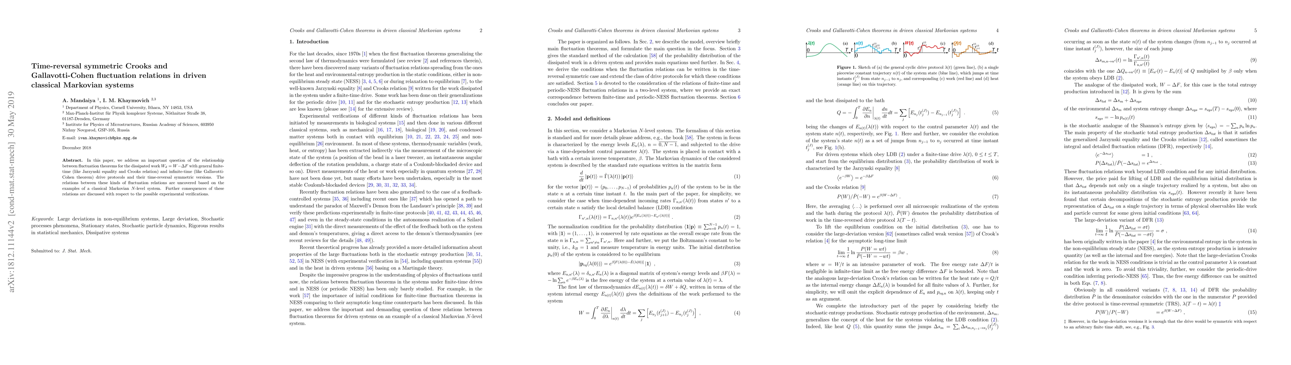 This paper explores the connections between fluctuation theorems for dissipated work in finite-time and infinite-time driven classical Markovian systems, using an $N$-level system to illustrate the relationships, and discusses potential experimental verifications of these relations.