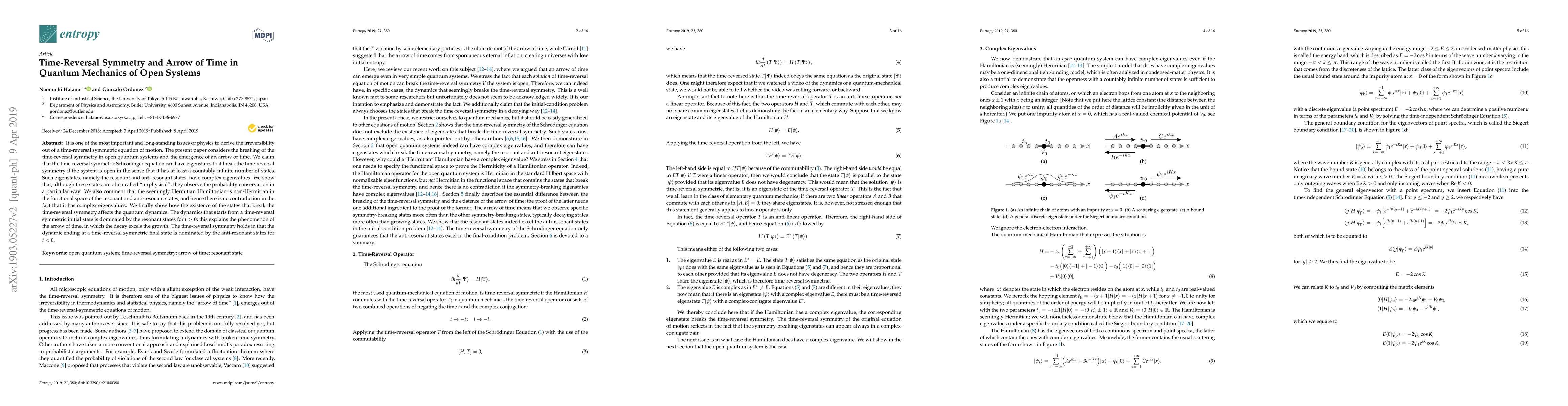 This paper explores how time-reversal symmetry can be broken in open quantum systems, leading to the emergence of an arrow of time. It demonstrates that resonant and anti-resonant states with complex eigenvalues can arise in such systems, explaining the dominance of decay over growth and the resulting irreversibility in quantum dynamics.