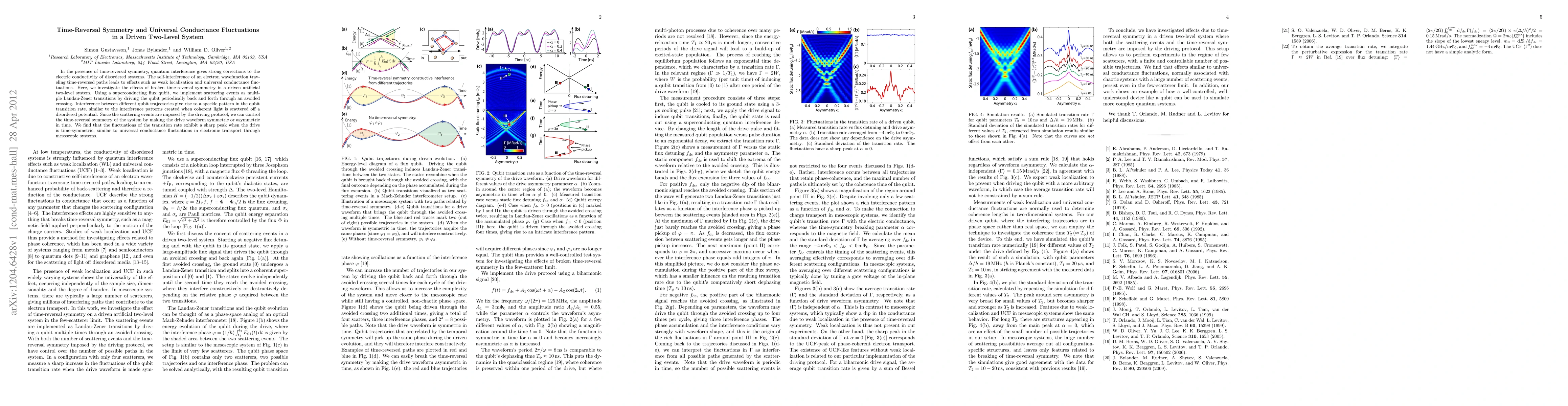 In the presence of time-reversal symmetry, quantum interference gives strong corrections to the electric conductivity of disordered systems. The self-interference of an electron wavefunction traveling time-reversed paths leads to effects such as weak localization and universal conductance fluctuations. Here, we investigate the effects of broken time-reversal symmetry in a driven artificial two-level system. Using a superconducting flux qubit, we implement scattering events as multiple Landau-Zener transitions by driving the qubit periodically back and forth through an avoided crossing. Interference between different qubit trajectories give rise to a speckle pattern in the qubit transition rate, similar to the interference patterns created when coherent light is scattered off a disordered potential. Since the scattering events are imposed by the driving protocol, we can control the time-reversal symmetry of the system by making the drive waveform symmetric or asymmetric in time. We find that the fluctuations of the transition rate exhibit a sharp peak when the drive is time-symmetric, similar to universal conductance fluctuations in electronic transport through mesoscopic systems.