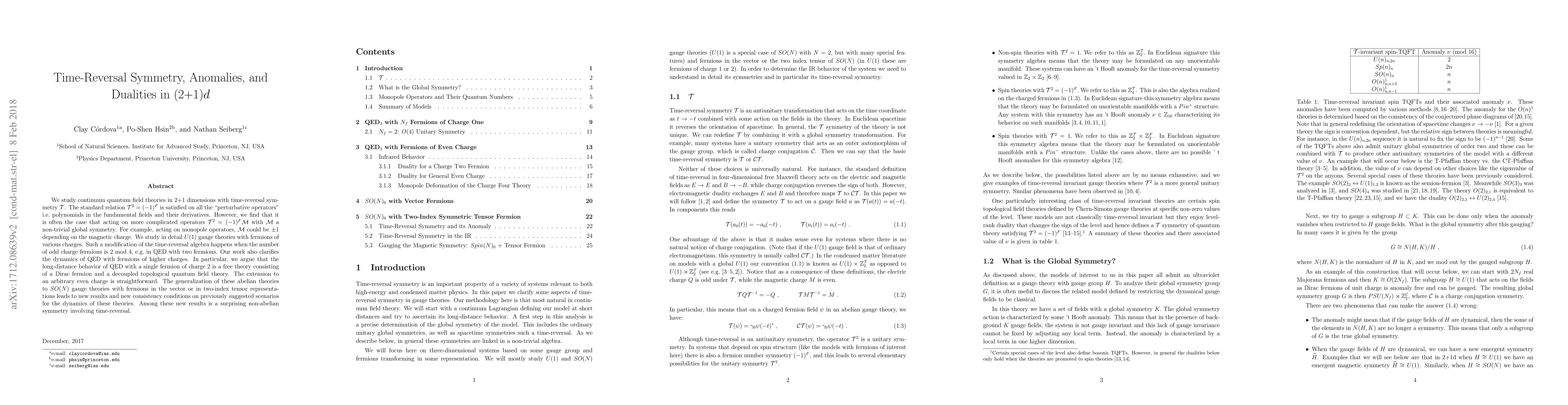We study continuum quantum field theories in 2+1 dimensions with time-reversal symmetry $\cal T$. The standard relation ${\cal T}^2=(-1)^F$ is satisfied on all the "perturbative operators" i.e. polynomials in the fundamental fields and their derivatives. However, we find that it is often the case that acting on more complicated operators ${\cal T}^2=(-1)^F {\cal M}$ with $\cal M$ a non-trivial global symmetry. For example, acting on monopole operators, $\cal M$ could be $\pm1$ depending on the magnetic charge. We study in detail $U(1)$ gauge theories with fermions of various charges. Such a modification of the time-reversal algebra happens when the number of odd charge fermions is $2 ~{\rm mod}~4$, e.g. in QED with two fermions. Our work also clarifies the dynamics of QED with fermions of higher charges. In particular, we argue that the long-distance behavior of QED with a single fermion of charge $2$ is a free theory consisting of a Dirac fermion and a decoupled topological quantum field theory. The extension to an arbitrary even charge is straightforward. The generalization of these abelian theories to $SO(N)$ gauge theories with fermions in the vector or in two-index tensor representations leads to new results and new consistency conditions on previously suggested scenarios for the dynamics of these theories. Among these new results is a surprising non-abelian symmetry involving time-reversal.