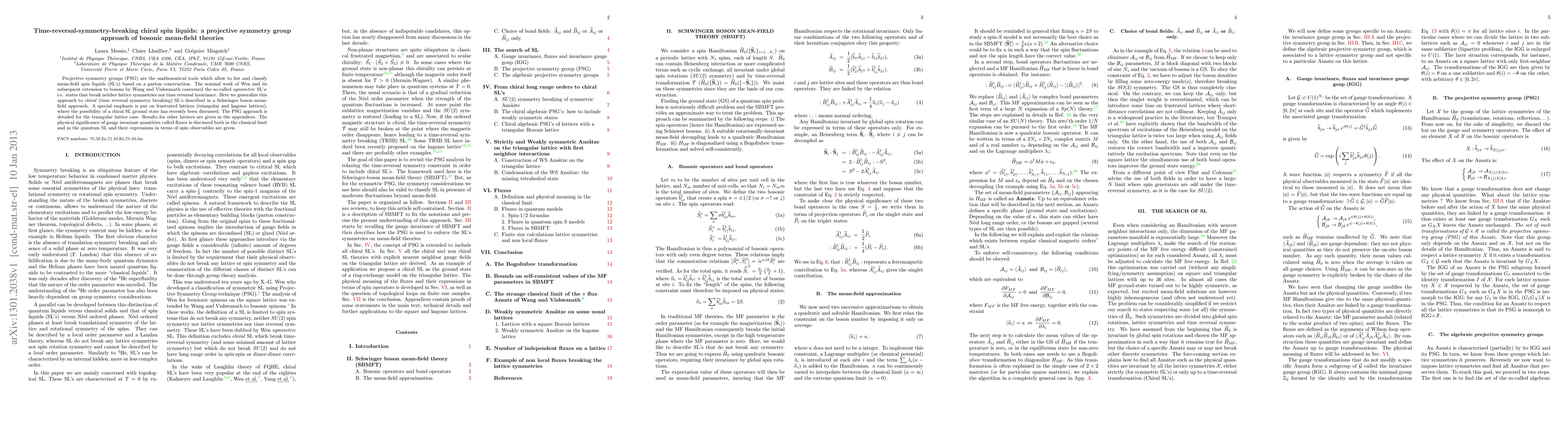 This paper generalizes the projective symmetry group (PSG) approach to classify bosonic mean-field theories of chiral spin liquids, which break time-reversal symmetry. It focuses on frustrated lattices like triangular and kagome, detailing the PSG approach for triangular lattices and discussing gauge invariant fluxes in both classical and quantum spin liquids.