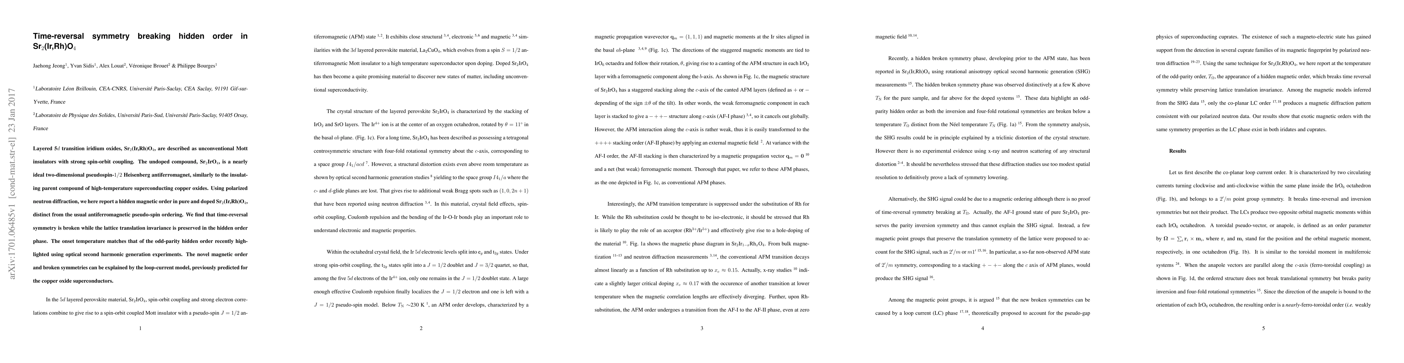 This research reveals a hidden magnetic order in Sr$_2$(Ir,Rh)O$_4$ with time-reversal symmetry breaking, identified via polarized neutron diffraction. Unlike typical antiferromagnetic ordering, this new phase preserves lattice translation invariance, suggesting a novel loop-current model explanation.