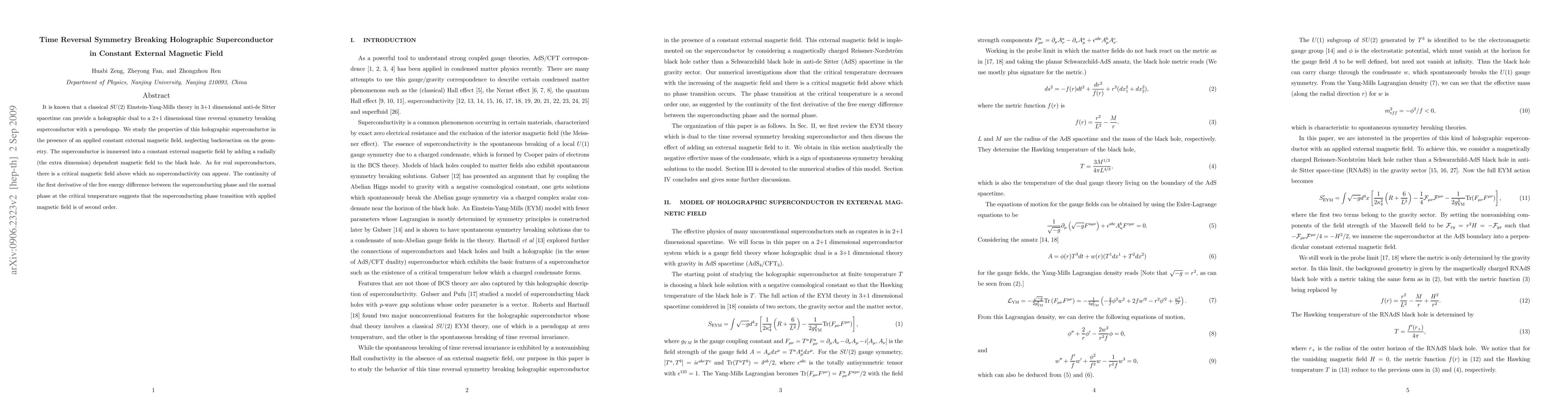 It is known that a classical SU(2) Einstein-Yang-Mills theory in 3+1 dimensional anti-de Sitter spacetime can provide a holographic dual to a 2+1 dimensional time reversal symmetry breaking superconductor with a pseudogap. We study the properties of this holographic superconductor in the presence of an applied constant external magnetic field, neglecting backreaction on the geometry. The superconductor is immersed into a constant external magnetic field by adding a radially (the extra dimension) dependent magnetic field to the black hole. As for real superconductors, there is a critical magnetic field above which no superconductivity can appear. The continuity of the first derivative of the free energy difference between the superconducting phase and the normal phase at the critical temperature suggests that the superconducting phase transition with applied magnetic field is of second order.