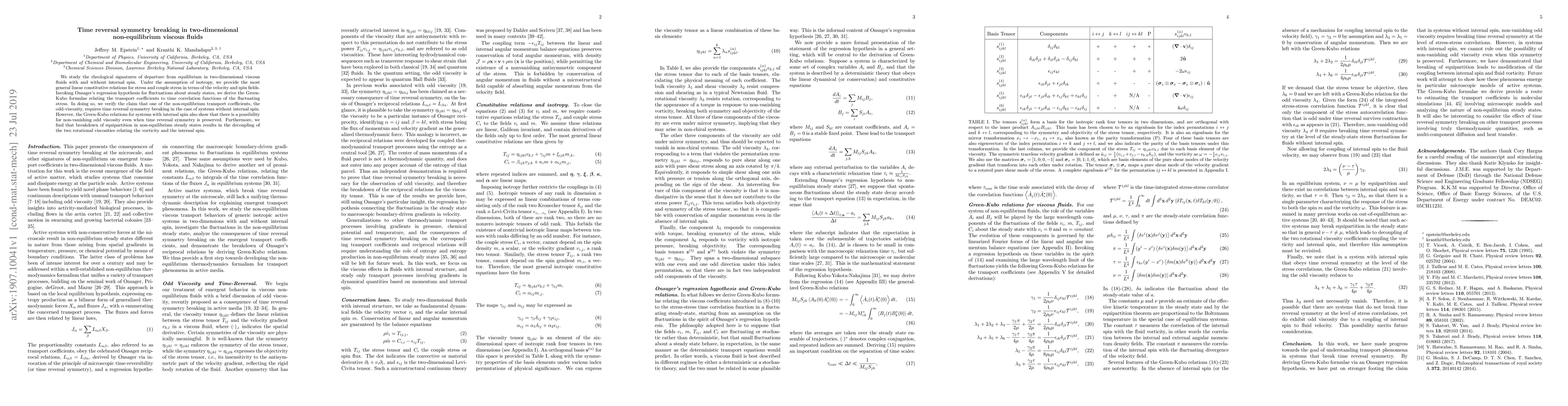 We study the rheological signatures of departure from equilibrium in two-dimensional viscous fluids with and without internal spin. Under the assumption of isotropy, we provide the most general linear constitutive relations for stress and couple stress in terms of the velocity and spin fields. Invoking Onsager's regression hypothesis for fluctuations about steady states, we derive the Green-Kubo formulae relating the transport coefficients to time correlation functions of the fluctuating stress. In doing so, we verify the claim that one of the non-equilibrium transport coefficients, the odd-viscosity, requires time reversal symmetry breaking in the case of systems without internal spin. However, the Green-Kubo relations for systems with internal spin also show that there is a possibility for non-vanishing odd viscosity even when time reversal symmetry is preserved. Furthermore, we find that breakdown of equipartition in non-equilibrium steady states results in the decoupling of the two rotational viscosities relating the vorticity and the internal spin.