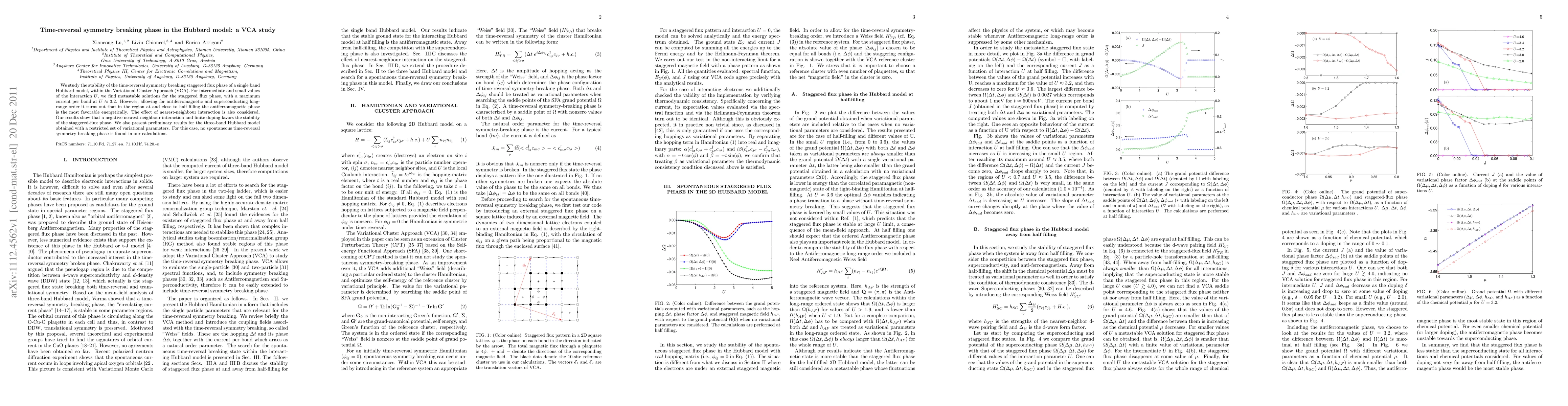 This study uses the Variational Cluster Approach to investigate the stability of the staggered flux phase in the Hubbard model, finding metastable solutions for intermediate interaction values. The antiferromagnetic phase is more energetically favorable near half filling, while negative nearest-neighbor interactions and finite doping enhance the stability of the staggered flux phase. Preliminary results for the three-band model show no spontaneous time-reversal symmetry breaking.