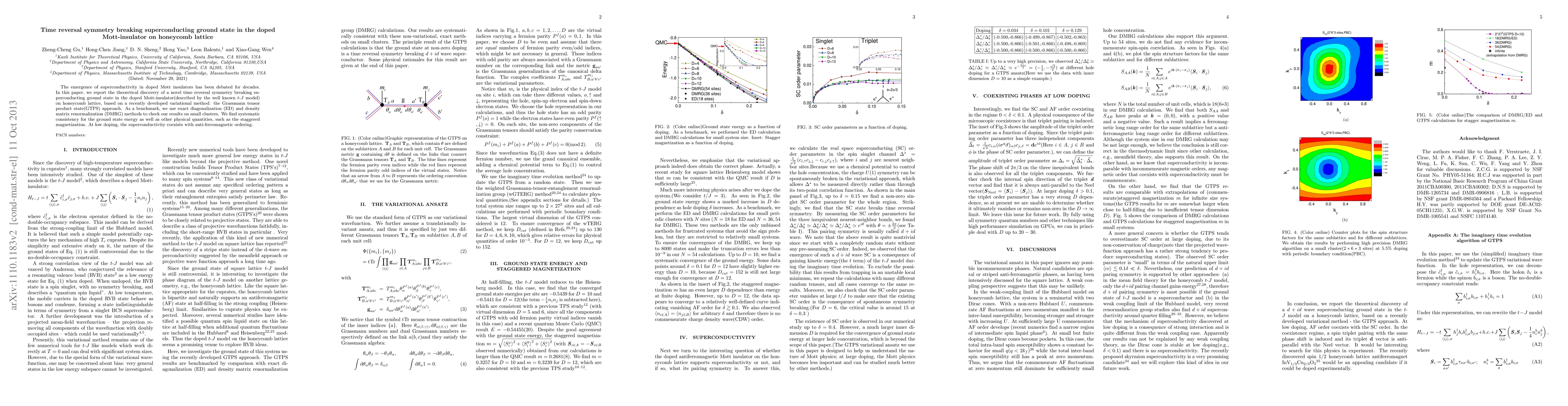 This paper reports the theoretical discovery of a time-reversal symmetry breaking superconducting state in doped Mott insulators on a honeycomb lattice using the Grassmann tensor product state approach. The findings are validated by exact diagonalization and density-matrix renormalization methods, showing consistent ground-state energy and staggered magnetization, with superconductivity coexisting with antiferromagnetic ordering at low doping.