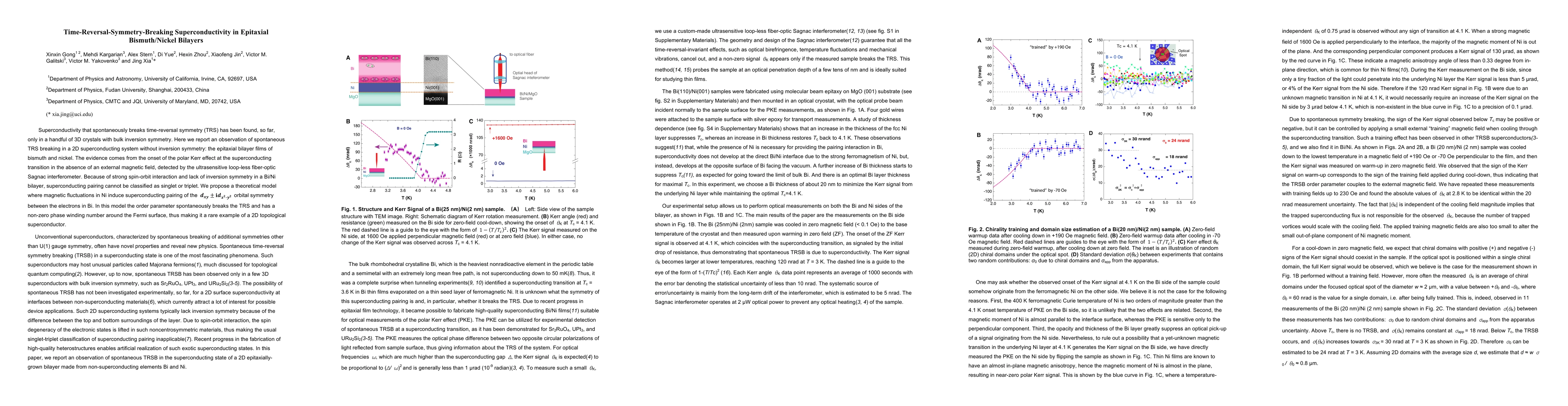 This paper reports the observation of time-reversal-symmetry-breaking superconductivity in epitaxial bismuth/nickel bilayers, a 2D system without inversion symmetry, evidenced by the polar Kerr effect. The proposed theoretical model suggests magnetic fluctuations in nickel induce unconventional dxy pairing in bismuth, classifying it as a topological superconductor.