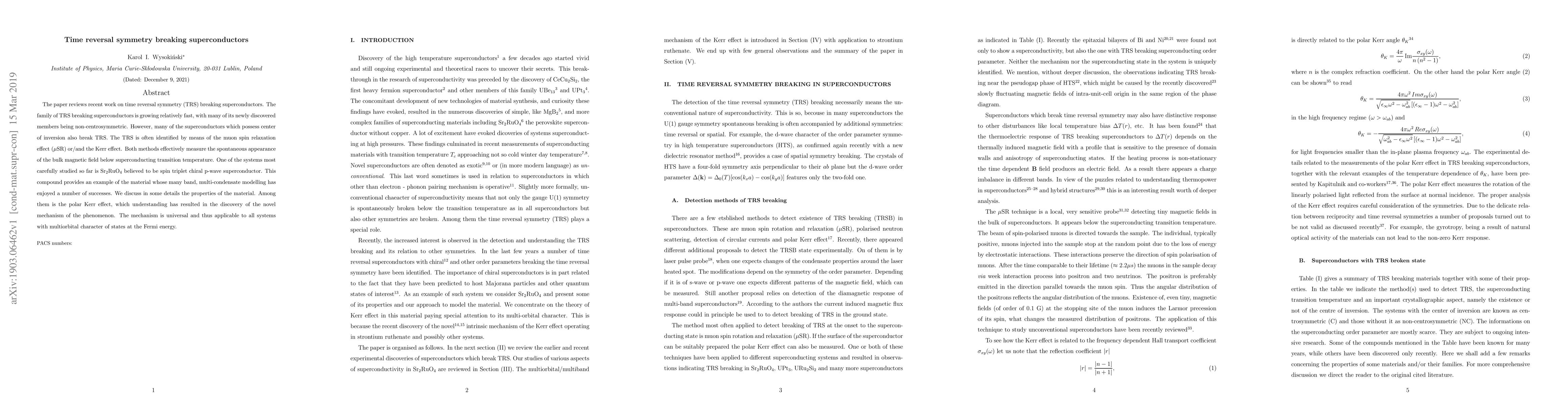 The paper reviews recent work on time reversal symmetry (TRS) breaking superconductors. The family of TRS breaking superconductors is growing relatively fast, with many of its newly discovered members being non-centrosymmetric. However, many of the superconductors which possess center of inversion also break TRS. The TRS is often identified by means of the muon spin relaxation effect ($\mu$SR) or/and the Kerr effect. Both methods effectively measure the spontaneous appearance of the bulk magnetic field below superconducting transition temperature. One of the systems most carefully studied so far is Sr$_2$RuO$_4$ believed to be spin triplet chiral p-wave superconductor. This compound provides an example of the material whose many band, multi-condensate modelling has enjoyed a number of successes. We discuss in some details the properties of the material. Among them is the polar Kerr effect, which understanding has resulted in the discovery of the novel mechanism of the phenomenon. The mechanism is universal and thus applicable to all systems with multiorbital character of states at the Fermi energy.