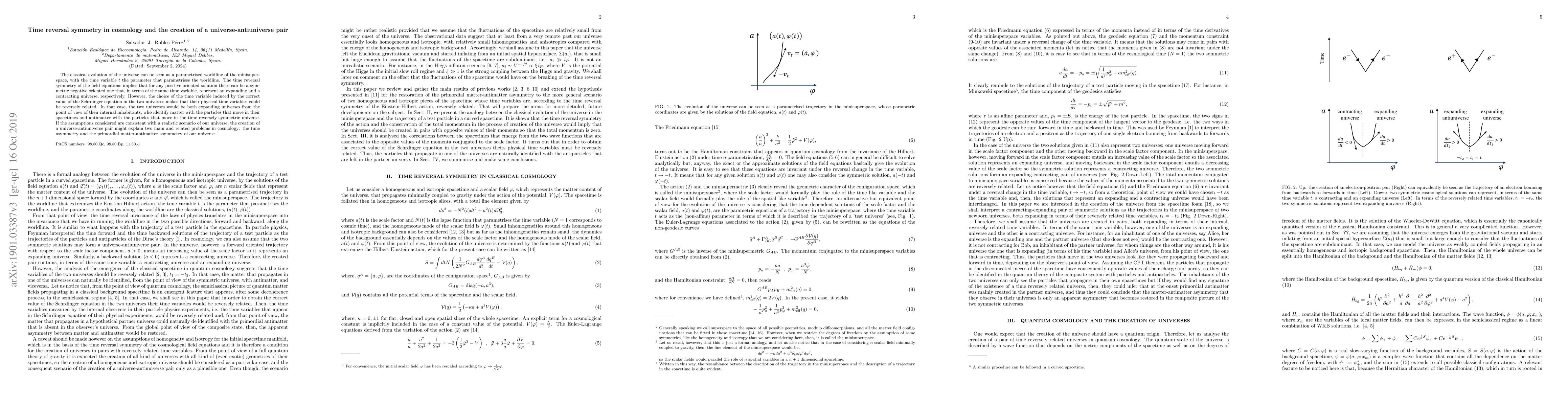 The classical evolution of the universe can be seen as a parametrised worldline of the minisuperspace, with the time variable $t$ the parameter that parametrises the worldline. The time reversal symmetry of the field equations implies that for any positive oriented solution there can be a symmetric negative oriented one that, in terms of the same time variable, represent an expanding and a contracting universe, respectively. However, the choice of the time variable induced by the correct value of the Schr\"odinger equation in the two universes makes that their physical time variables could be reversely related. In that case, the two universes would be both expanding universes from the point of view of their internal inhabitants, who identify matter with the particles that move in their spacetimes and antimatter with the particles that move in the time reversely symmetric universe. If the assumptions considered are consistent with a realistic scenario of our universe, the creation of a universe-antiuniverse pair might explain two main and related problems in cosmology: the time asymmetry and the primordial matter-antimatter asymmetry of our universe.