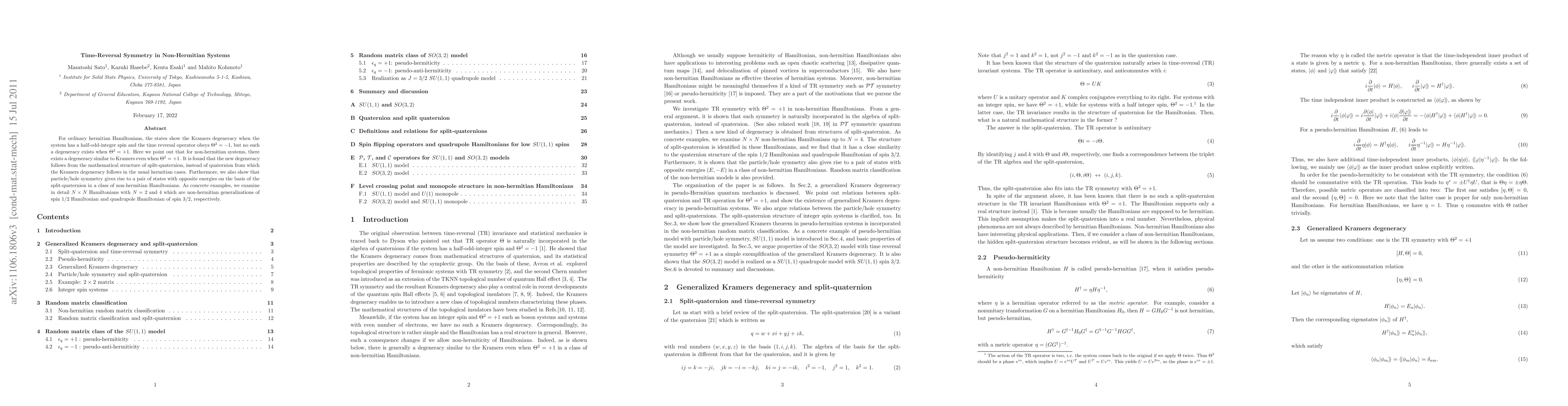 This paper explores time-reversal symmetry in non-Hermitian systems, revealing a new form of degeneracy similar to Kramers' theorem even when the time reversal operator satisfies \Theta^2=+1. This new degeneracy arises from the mathematical structure of split-quaternions, contrasting with the usual quaternion-based Kramers degeneracy in Hermitian systems.
