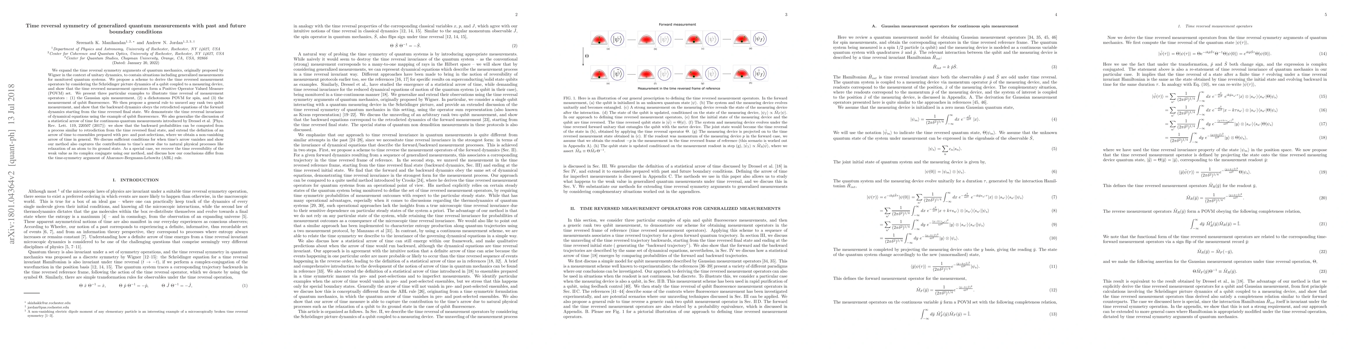 We expand the time reversal symmetry arguments of quantum mechanics, originally proposed by Wigner in the context of unitary dynamics, to contain situations including generalized measurements for monitored quantum systems. We propose a scheme to derive the time reversed measurement operators by considering the Schr\"{o}dinger picture dynamics of a qubit coupled to a measuring device, and show that the time reversed measurement operators form a Positive Operator Valued Measure (POVM) set. We present three particular examples to illustrate time reversal of measurement operators: (1) the Gaussian spin measurement, (2) a dichotomous POVM for spin, and (3) the measurement of qubit fluorescence. We then propose a general rule to unravel any rank two qubit measurement, and show that the backward dynamics obeys the retrodicted equations of the forward dynamics starting from the time reversed final state. We demonstrate the time reversal invariance of dynamical equations using the example of qubit fluorescence. We also generalize the discussion of a statistical arrow of time for continuous quantum measurements introduced by Dressel et al. [Phys. Rev. Lett. 119, 220507 (2017)]: we show that the backward probabilities can be computed from a process similar to retrodiction from the time reversed final state, and extend the definition of an arrow of time to ensembles prepared with pre- and post-selections, where we obtain a non-vanishing arrow of time in general. We discuss sufficient conditions for when time's arrow vanishes and show our method also captures the contributions to time's arrow due to natural physical processes like relaxation of an atom to its ground state. As a special case, we recover the time reversibility of the weak value as its complex conjugate using our method, and discuss how our conclusions differ from the time-symmetry argument of Aharonov-Bergmann-Lebowitz (ABL) rule.