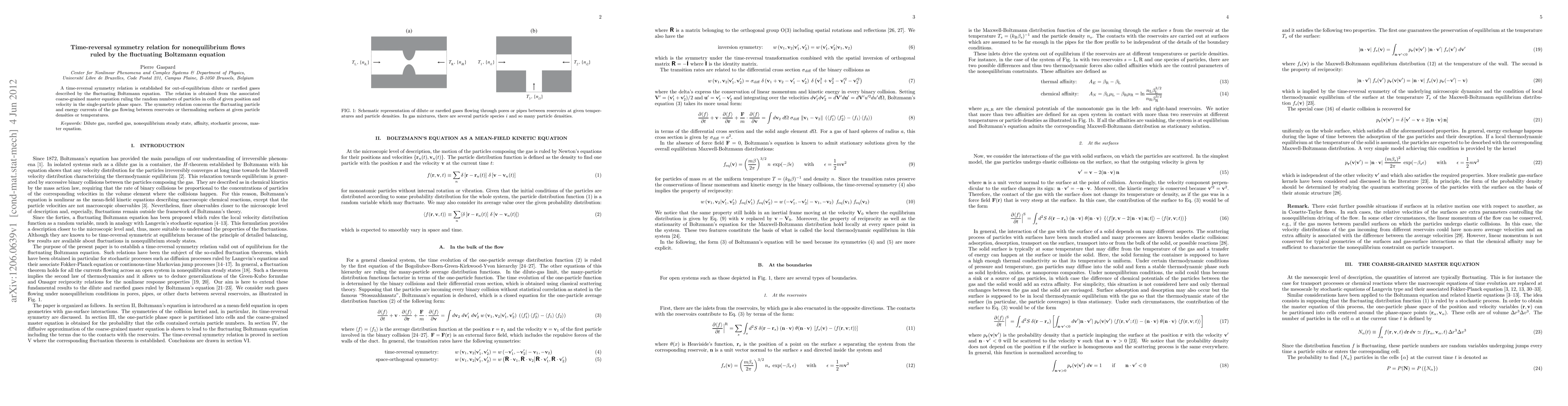 A time-reversal symmetry relation is established for out-of-equilibrium dilute or rarefied gases described by the fluctuating Boltzmann equation. The relation is obtained from the associated coarse-grained master equation ruling the random numbers of particles in cells of given position and velocity in the single-particle phase space. The symmetry relation concerns the fluctuating particle and energy currents of the gas flowing between reservoirs or thermalizing surfaces at given particle densities or temperatures.