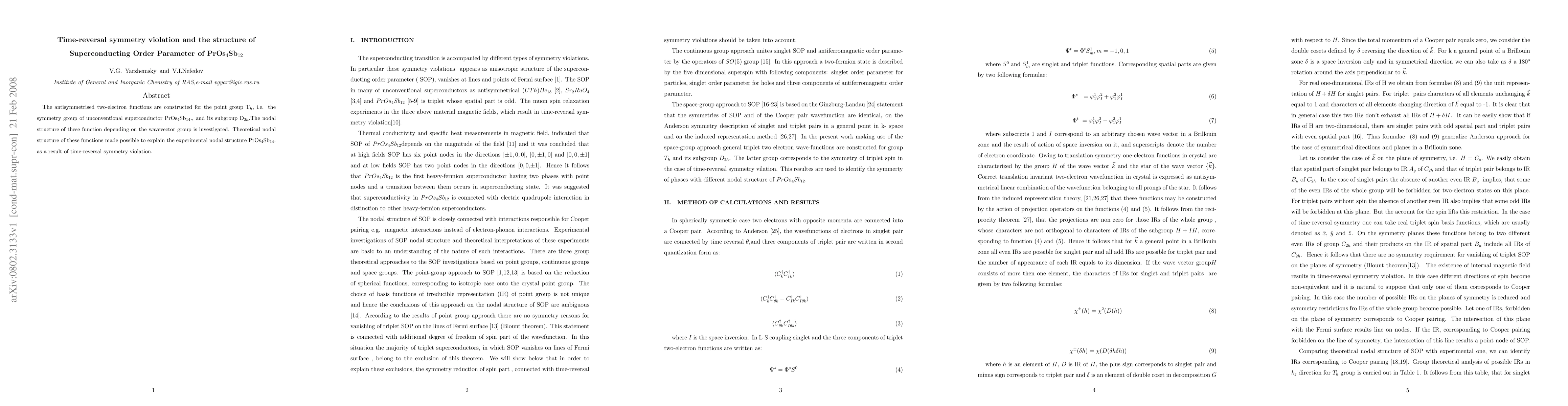 The antisymmetrised two-electron functions are constructed for the point group T$_{h}$, i.e. the symmetry group of unconventional superconductor PrOs$% _{4}$Sb$_{14}$., and its subgroup D$_{2h}$.The nodal structure of these function depending on the wavevector group is investigated. Theoretical nodal structure of these functions made possible to explain the experimental nodal structure PrOs$_{4}$Sb$_{14}$. as a result of time-reversal symmetry violation.