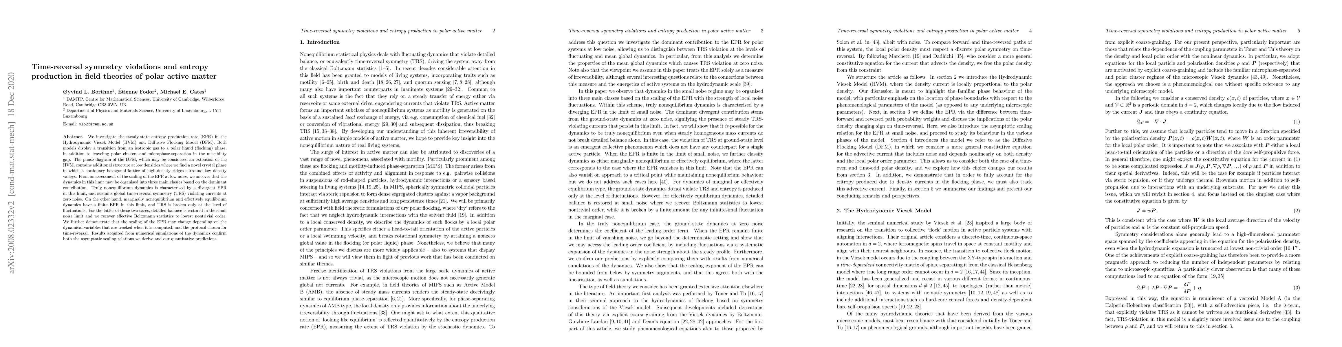 We investigate the steady-state entropy production rate (EPR) in the Hydrodynamic Vicsek Model (HVM) and Diffusive Flocking Model (DFM). Both models display a transition from an isotropic gas to a polar liquid (flocking) phase, in addition to traveling polar clusters and microphase-separation in the miscibility gap. The phase diagram of the DFM, which may be considered an extension of the HVM, contains additional structure at low densities where we find a novel crystal phase in which a stationary hexagonal lattice of high-density ridges surround low density valleys. From an assessment of the scaling of the EPR at low noise, we uncover that the dynamics in this limit may be organised into three main classes based on the dominant contribution. Truly nonequilibrium dynamics is characterised by a divergent EPR in this limit, and sustains global time-reversal symmetry (TRS) violating currents at zero noise. On the other hand, marginally nonequilibrium and effectively equilibrium dynamics have a finite EPR in this limit, and TRS is broken only at the level of fluctuations. For the latter of these two cases, detailed balance is restored in the small noise limit and we recover effective Boltzmann statistics to lowest nontrivial order. We further demonstrate that the scaling of the EPR may change depending on the dynamical variables that are tracked when it is computed, and the protocol chosen for time-reversal. Results acquired from numerical simulations of the dynamics confirm both the asymptotic scaling relations we derive and our quantitative predictions.