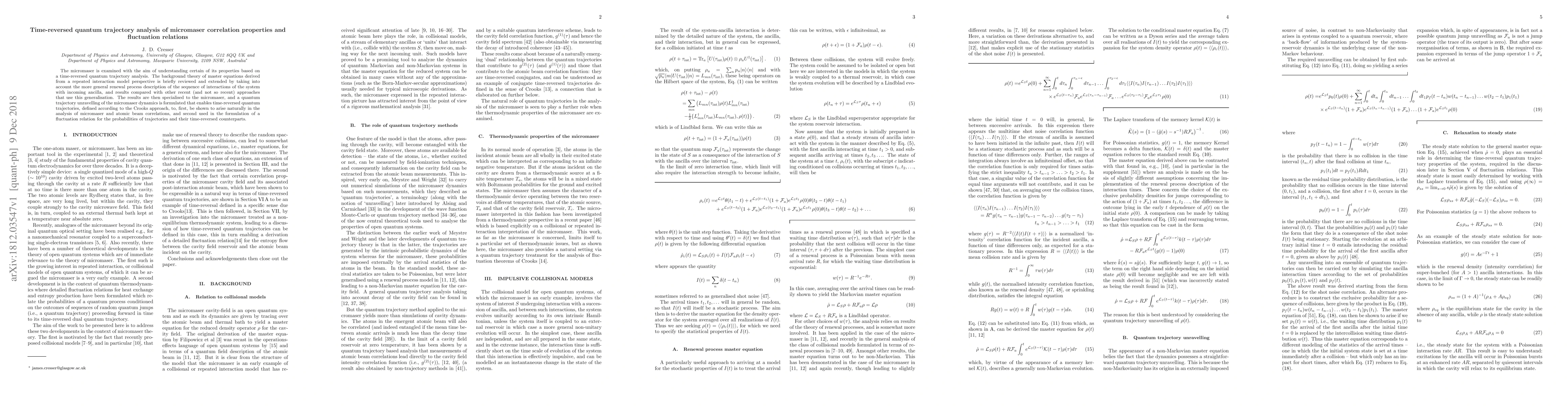 The micromaser is examined with the aim of understanding certain of its properties based on a time-reversed quantum trajectory analysis. The background theory of master equations derived from a repeated interaction model perspective is briefly reviewed and extended by taking into account the more general renewal process description of the sequence of interactions of the system with incoming ancilla, and results compared with other recent (and not so recent) approaches that use this generalisation. The results are then specialised to the micromaser, and a quantum trajectory unravelling of the micromaser dynamics is formulated that enables time-reversed quantum trajectories, defined according to the Crooks approach, to, first, be shown to arise naturally in the analysis of micromaser and atomic beam correlations, and second used in the formulation of a fluctuation relation for the probabilities of trajectories and their time-reversed counterparts.