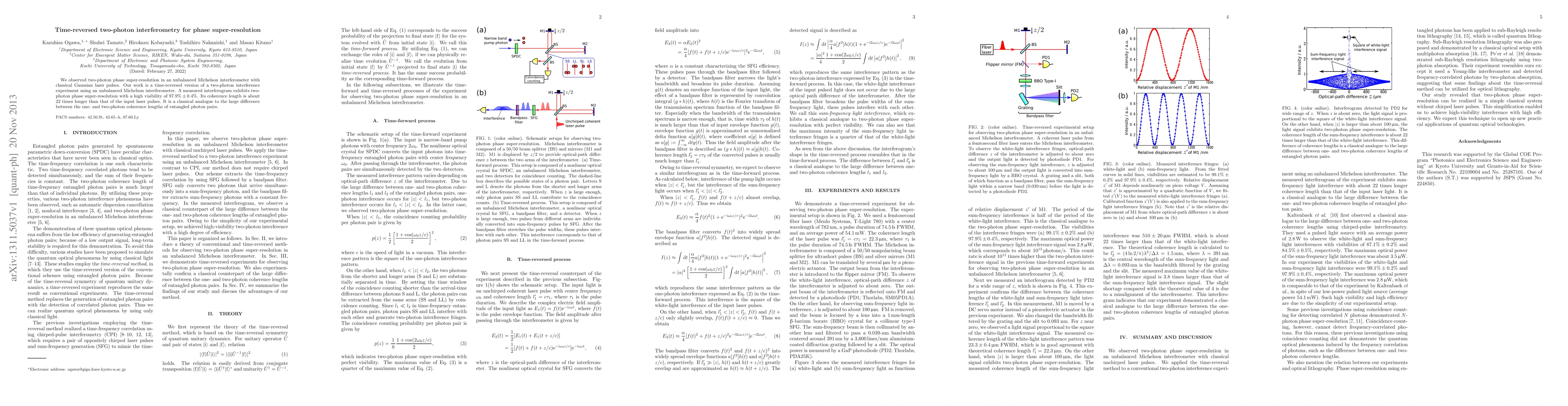 This paper reports on achieving two-photon phase super-resolution in an unbalanced Michelson interferometer using classical Gaussian laser pulses, demonstrating a high visibility of 97.9% and a coherence length 22 times longer than the input pulses, akin to the differences seen in entangled photon pairs.