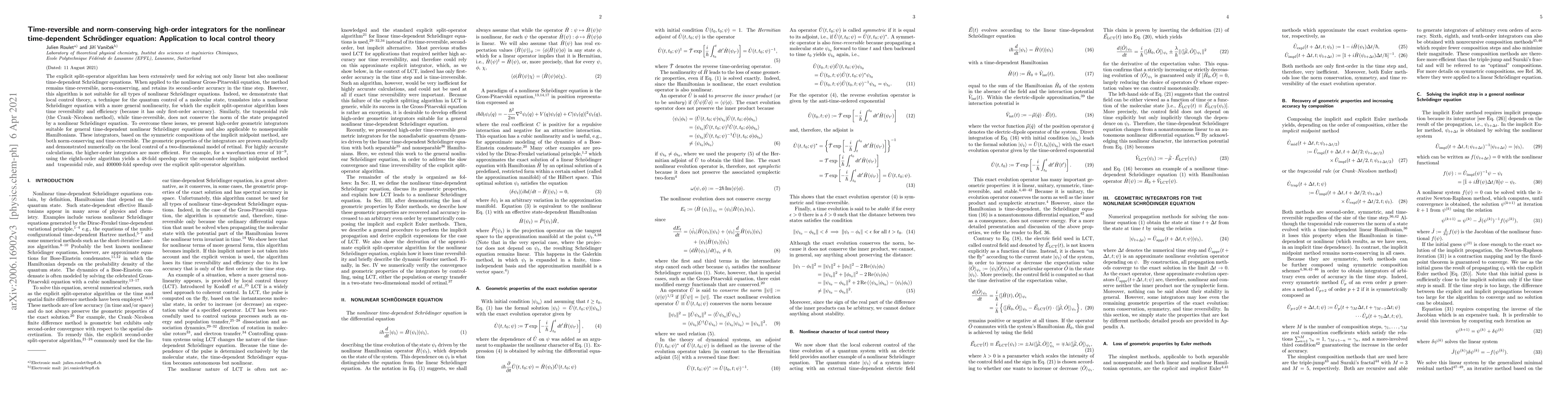 The explicit split-operator algorithm has been extensively used for solving not only linear but also nonlinear time-dependent Schr\"{o}dinger equations. When applied to the nonlinear Gross-Pitaevskii equation, the method remains time-reversible, norm-conserving, and retains its second-order accuracy in the time step. However, this algorithm is not suitable for all types of nonlinear Schr\"{o}dinger equations. Indeed, we demonstrate that local control theory, a technique for the quantum control of a molecular state, translates into a nonlinear Schr\"{o}dinger equation with a more general nonlinearity, for which the explicit split-operator algorithm loses time reversibility and efficiency (because it has only first-order accuracy). Similarly, the trapezoidal rule (the Crank-Nicolson method), while time-reversible, does not conserve the norm of the state propagated by a nonlinear Schr\"{o}dinger equation. To overcome these issues, we present high-order geometric integrators suitable for general time-dependent nonlinear Schr\"{o}dinger equations and also applicable to nonseparable Hamiltonians. These integrators, based on the symmetric compositions of the implicit midpoint method, are both norm-conserving and time-reversible. The geometric properties of the integrators are proven analytically and demonstrated numerically on the local control of a two-dimensional model of retinal. For highly accurate calculations, the higher-order integrators are more efficient. For example, for a wavefunction error of $10^{-9}$, using the eighth-order algorithm yields a $48$-fold speedup over the second-order implicit midpoint method and trapezoidal rule, and $400000$-fold speedup over the explicit split-operator algorithm.