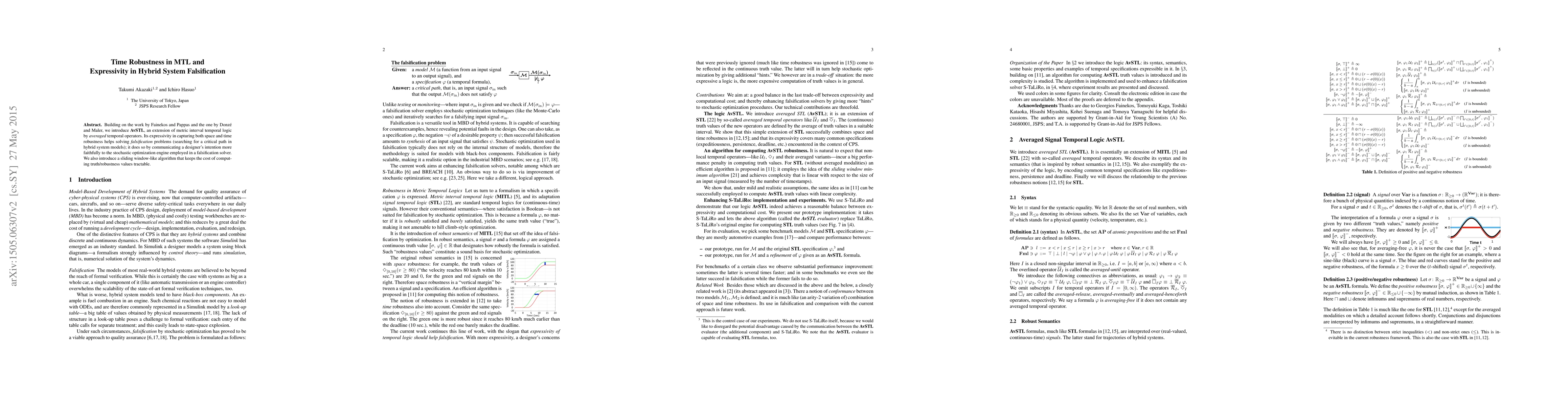 Building on the work by Fainekos and Pappas and the one by Donze and Maler, we introduce AvSTL, an extension of metric interval temporal logic by averaged temporal operators. Its expressivity in capturing both space and time robustness helps solving falsification problems, (i.e. searching for a critical path in hybrid system models); it does so by communicating a designer's intention more faithfully to the stochastic optimization engine employed in a falsification solver. We also introduce a sliding window-like algorithm that keeps the cost of computing truth/robustness values tractable.