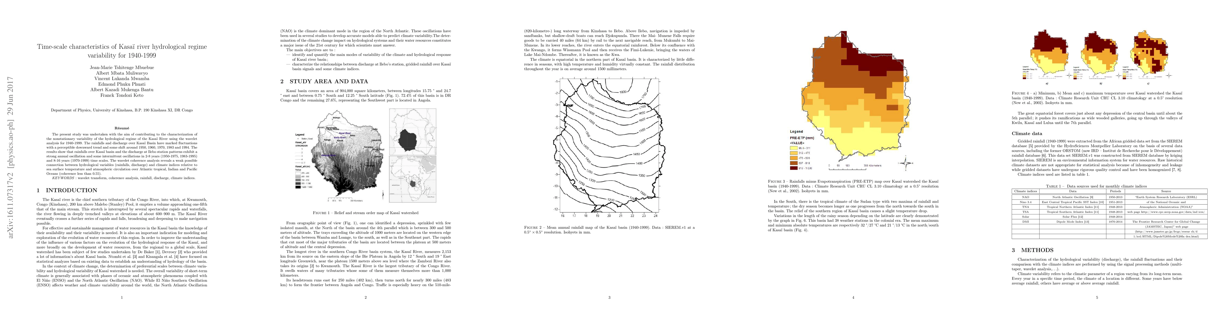 This study uses wavelet analysis to examine Kasai River's hydrological regime from 1940-1999, identifying significant annual fluctuations and intermittent cycles of 2-8 years and 8-16 years in rainfall and discharge. The research finds weak connections between hydrological variables and climate indices, suggesting nonstationary variability in the basin's hydrology.