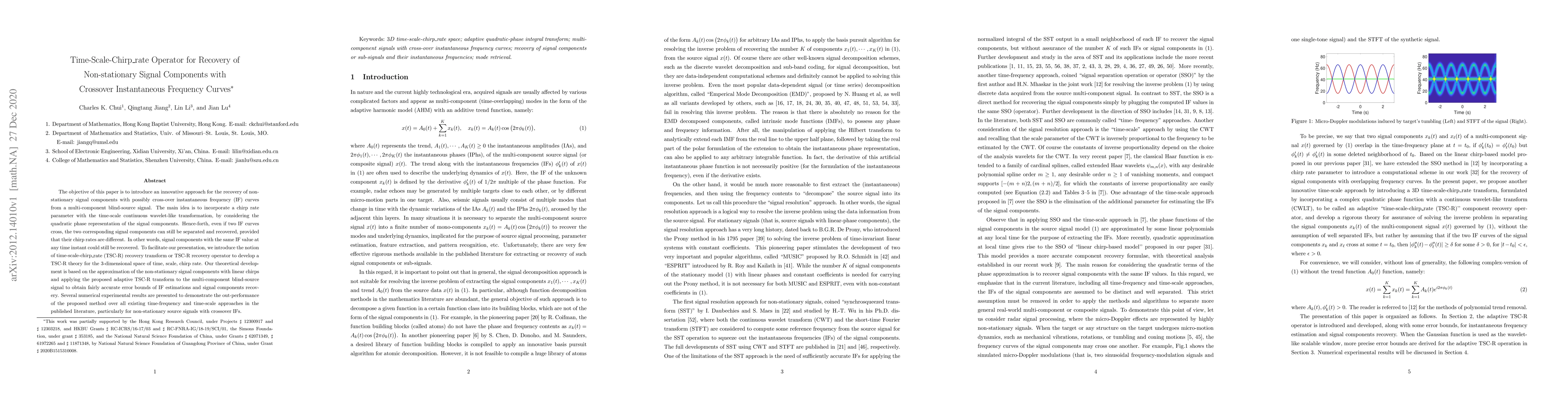 The objective of this paper is to introduce an innovative approach for the recovery of non-stationary signal components with possibly cross-over instantaneous frequency (IF) curves from a multi-component blind-source signal. The main idea is to incorporate a chirp rate parameter with the time-scale continuous wavelet-like transformation, by considering the quadratic phase representation of the signal components. Hence-forth, even if two IF curves cross, the two corresponding signal components can still be separated and recovered, provided that their chirp rates are different. In other words, signal components with the same IF value at any time instant could still be recovered. To facilitate our presentation, we introduce the notion of time-scale-chirp_rate (TSC-R) recovery transform or TSC-R recovery operator to develop a TSC-R theory for the 3-dimensional space of time, scale, chirp rate. Our theoretical development is based on the approximation of the non-stationary signal components with linear chirps and applying the proposed adaptive TSC-R transform to the multi-component blind-source signal to obtain fairly accurate error bounds of IF estimations and signal components recovery. Several numerical experimental results are presented to demonstrate the out-performance of the proposed method over all existing time-frequency and time-scale approaches in the published literature, particularly for non-stationary source signals with crossover IFs.