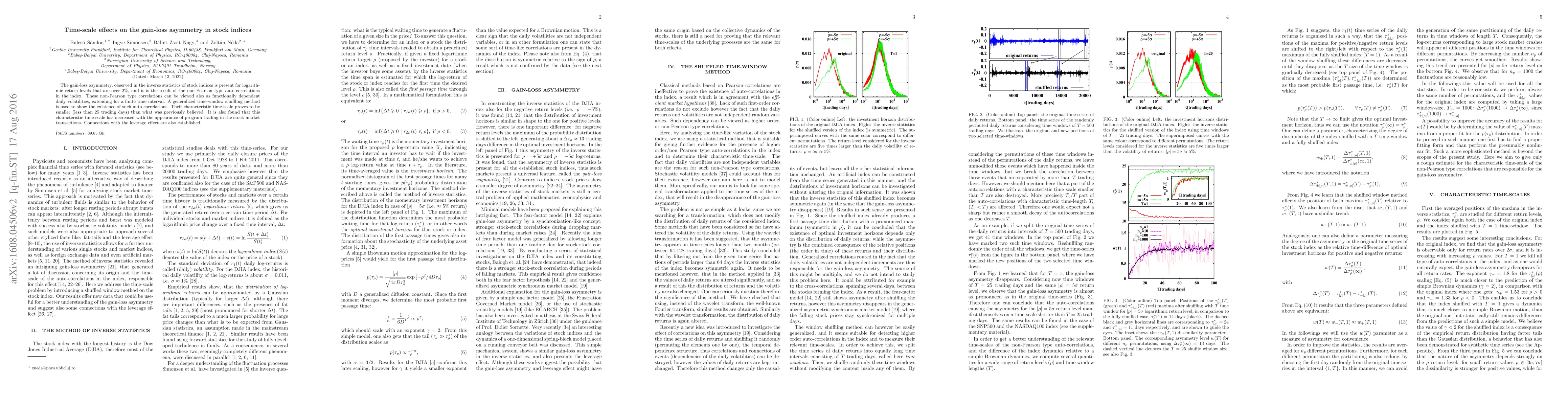 The gain-loss asymmetry, observed in the inverse statistics of stock indices is present for logarithmic return levels that are over $2\%$, and it is the result of the non-Pearson type auto-correlations in the index. These non-Pearson type correlations can be viewed also as functionally dependent daily volatilities, extending for a finite time interval. A generalized time-window shuffling method is used to show the existence of such auto-correlations. Their characteristic time-scale proves to be smaller (less than $25$ trading days) than what was previously believed. It is also found that this characteristic time-scale has decreased with the appearance of program trading in the stock market transactions. Connections with the leverage effect are also established.