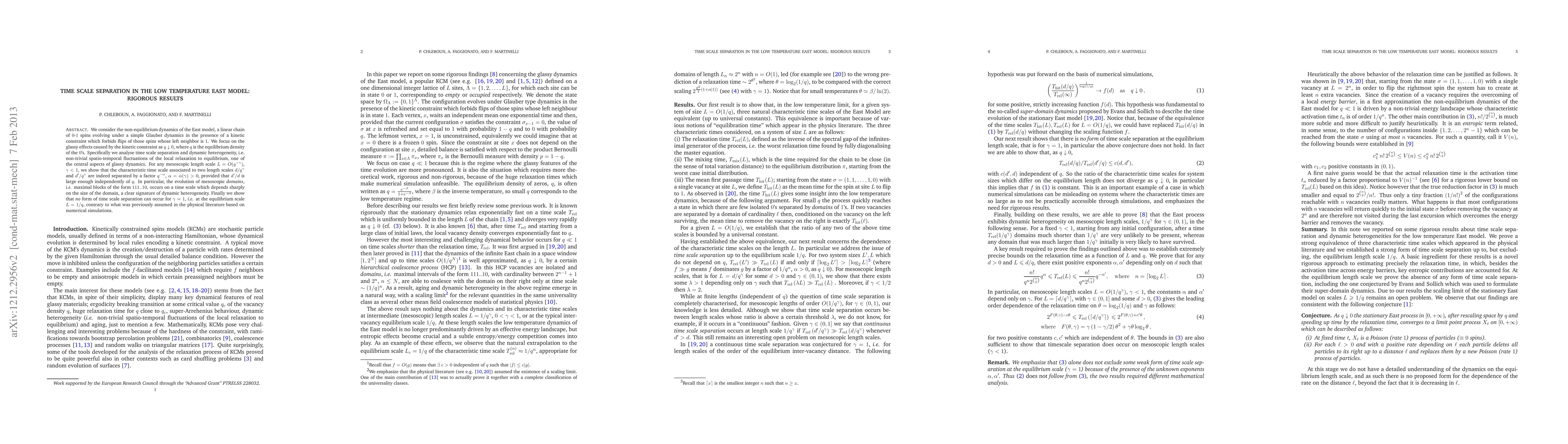 This paper rigorously analyzes the non-equilibrium dynamics of the East model, demonstrating time scale separation and dynamic heterogeneity as the equilibrium density of 0's approaches zero. It shows that characteristic time scales for different mesoscopic length scales are separated by a factor $q^{-a}$, highlighting the distinct relaxation times for different domain sizes.