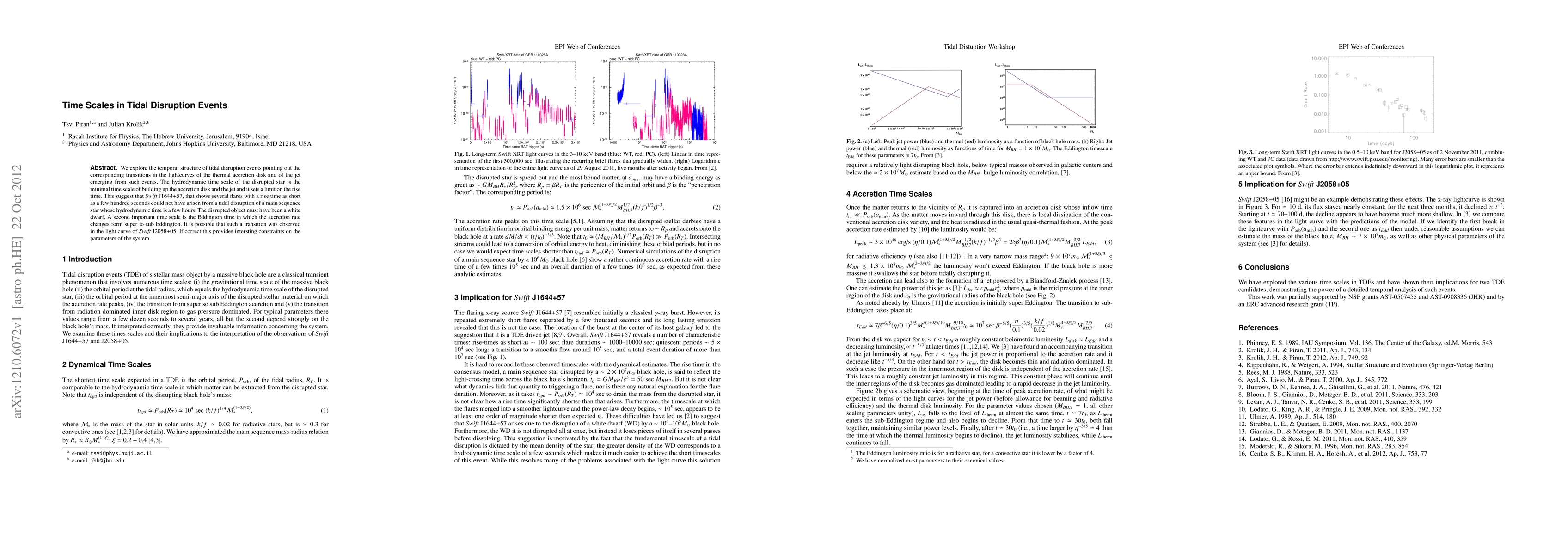 We explore the temporal structure of tidal disruption events pointing out the corresponding transitions in the lightcurves of the thermal accretion disk and of the jet emerging from such events. The hydrodynamic time scale of the disrupted star is the minimal time scale of building up the accretion disk and the jet and it sets a limit on the rise time. This suggest that Swift J1644+57, that shows several flares with a rise time as short as a few hundred seconds could not have arisen from a tidal disruption of a main sequence star whose hydrodynamic time is a few hours. The disrupted object must have been a white dwarf. A second important time scale is the Eddington time in which the accretion rate changes form super to sub Eddington. It is possible that such a transition was observed in the light curve of Swift J2058+05. If correct this provides intersting constraints on the parameters of the system.