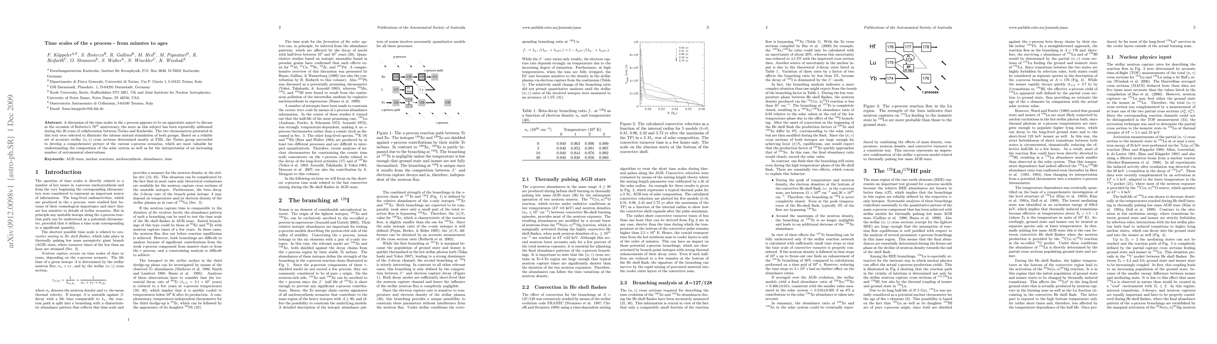 A discussion of the time scales in the s process appears to be an approriate aspect to discuss at the occasion of 70th anniversary of Roberto Gallino, the more as this subject has been repeatedly addressed during the 20 years of collaboration between Torino and Karlsruhe. The two chronometers presented in this text were selected to illustrate the intense mutual stimulation of both groups. Based on a reliable set of accurate stellar (n, gamma) cross sections determined mostly at FZK, the Torino group succeeded to develop a comprehensive picture of the various s-process scenarios, which are most valuable for understanding the composition of the solar system as well as for the interpretation of an increasing number of astronomical observations.