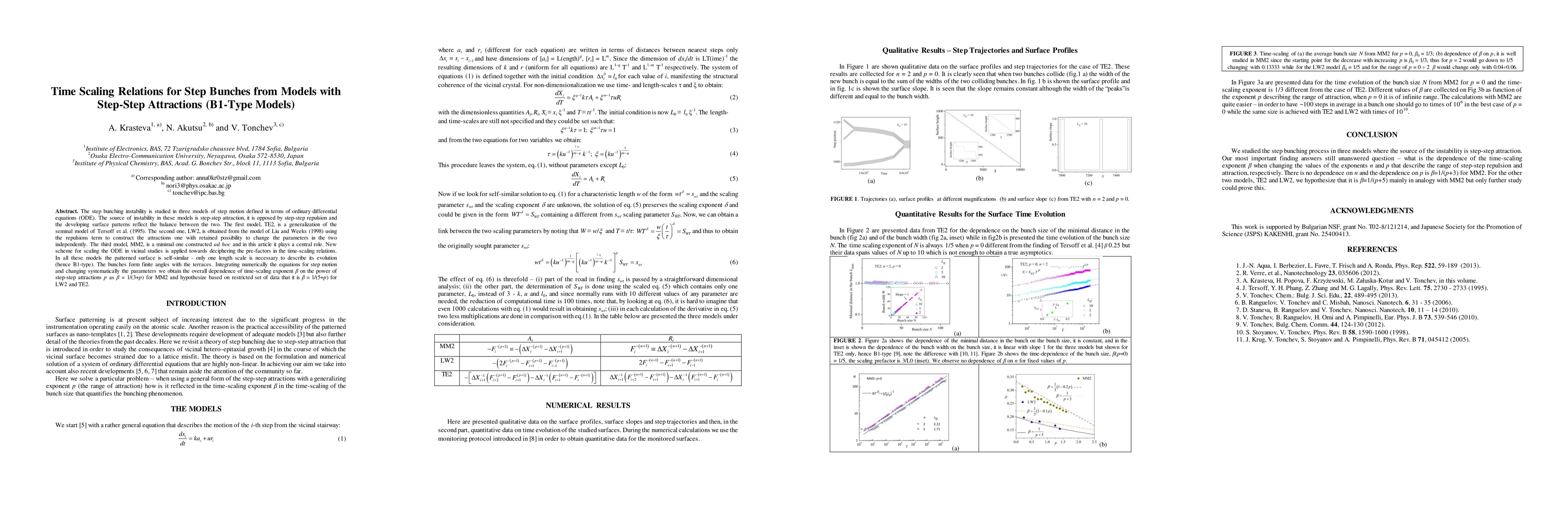 This research investigates step bunching instability in three models of step motion using ordinary differential equations (ODE). The study finds a time-scaling relation for pattern formation, u03beta = 1/(3+p) for MM2 model and hypothesizes u03beta = 1/(5+p) for LW2 and TE2 models. The surface patterns are self-similar, described by a single length scale, and form finite angles with terraces.