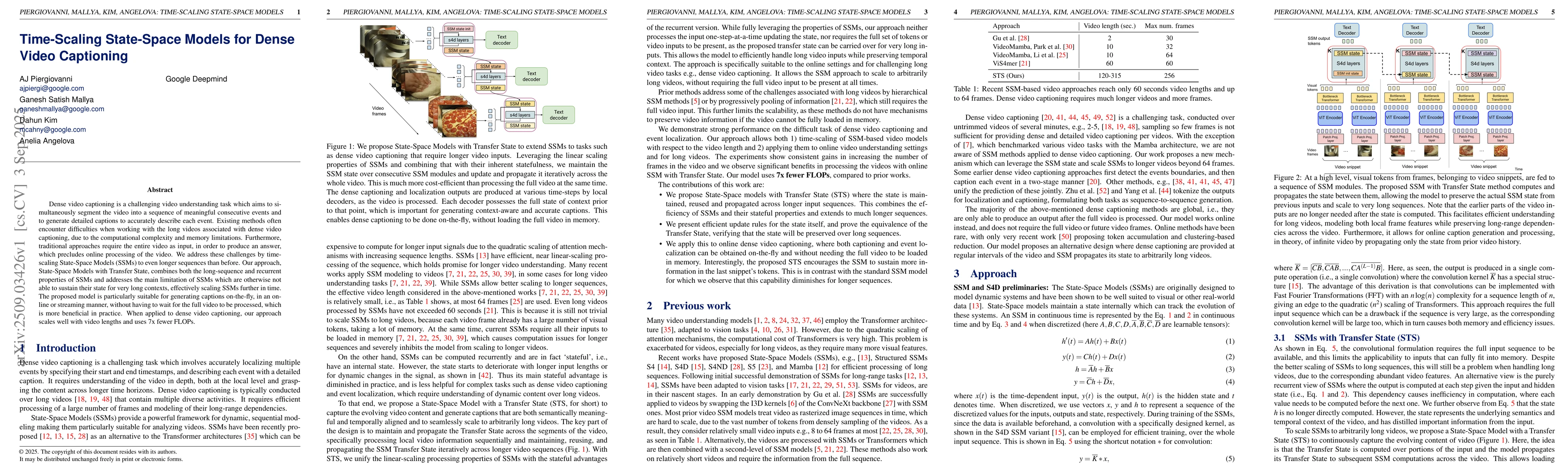 Dense video captioning is a challenging video understanding task which aims to simultaneously segment the video into a sequence of meaningful consecutive events and to generate detailed captions to accurately describe each event. Existing methods often encounter difficulties when working with the long videos associated with dense video captioning, due to the computational complexity and memory limitations. Furthermore, traditional approaches require the entire video as input, in order to produce an answer, which precludes online processing of the video. We address these challenges by time-scaling State-Space Models (SSMs) to even longer sequences than before. Our approach, State-Space Models with Transfer State, combines both the long-sequence and recurrent properties of SSMs and addresses the main limitation of SSMs which are otherwise not able to sustain their state for very long contexts, effectively scaling SSMs further in time. The proposed model is particularly suitable for generating captions on-the-fly, in an online or streaming manner, without having to wait for the full video to be processed, which is more beneficial in practice. When applied to dense video captioning, our approach scales well with video lengths and uses 7x fewer FLOPs.