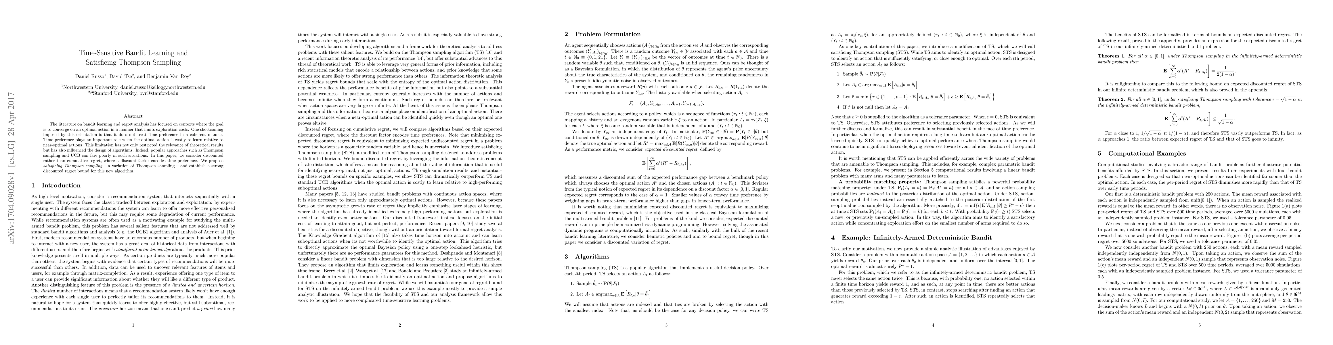 This paper addresses the limitation of traditional bandit learning algorithms in handling time preference, proposing satisficing Thompson sampling with a discounted regret bound to better accommodate situations where optimal actions are costly to learn. The new approach aims to limit exploration costs while respecting temporal considerations.