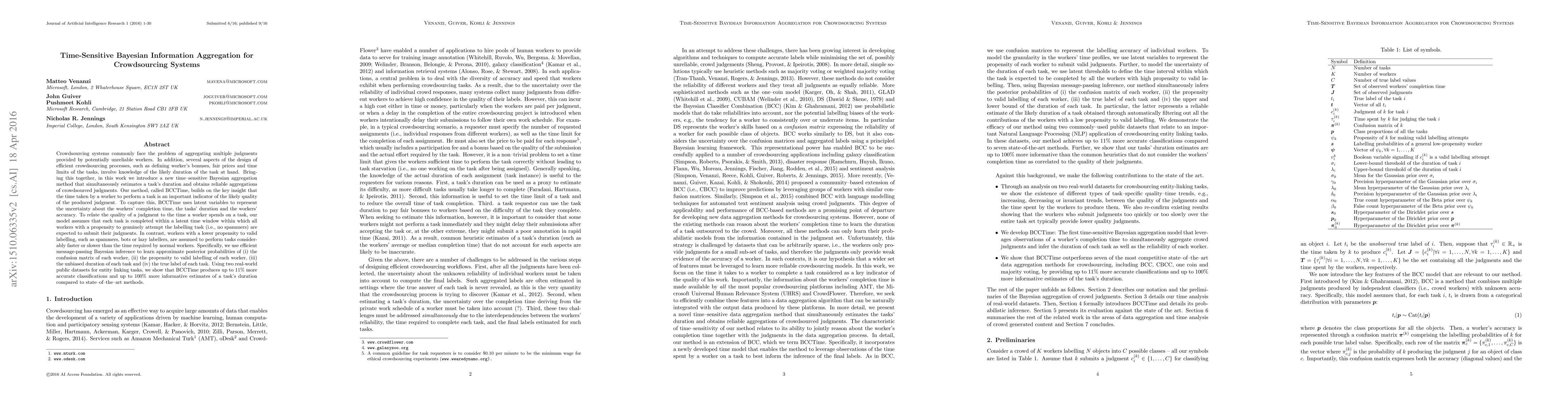 This paper introduces BCCTime, a time-sensitive Bayesian aggregation method for crowdsourcing systems that estimates task duration and aggregates reliable crowdsourced judgments. BCCTime uses latent variables to model worker completion times and task durations, showing up to 11% more accurate classifications and 100% more informative duration estimates compared to existing methods.