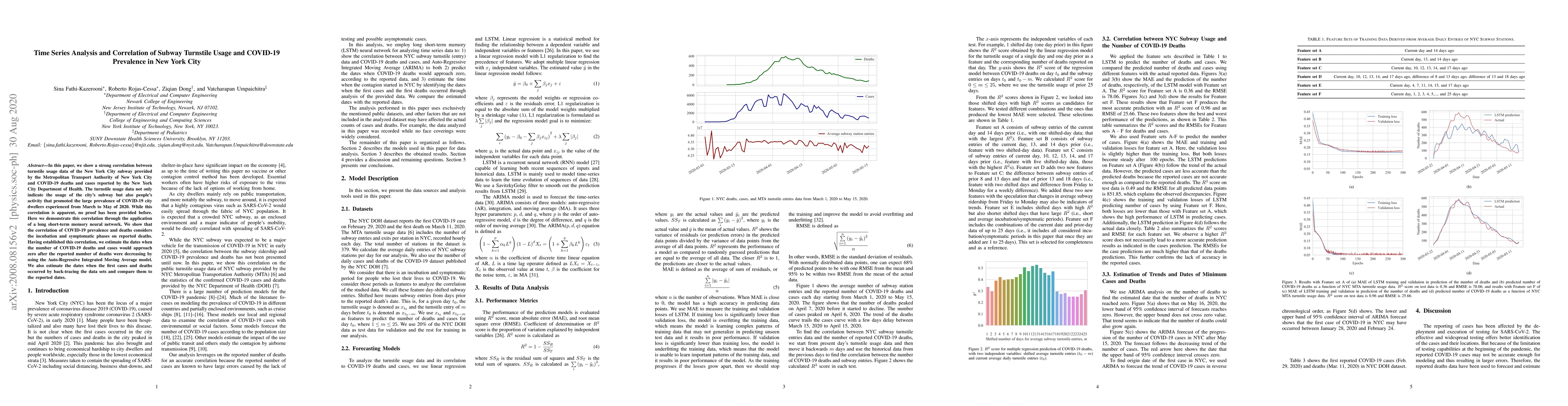 In this paper, we show a strong correlation between turnstile usage data of the New York City subway provided by the Metropolitan Transport Authority of New York City and COVID-19 deaths and cases reported by the New York City Department of Health. The turnstile usage data not only indicate the usage of the city's subway but also people's activity that promoted the large prevalence of COVID-19 city dwellers experienced from March to May of 2020. While this correlation is apparent, no proof has been provided before. Here we demonstrate this correlation through the application of a long short-term memory neural network. We show that the correlation of COVID-19 prevalence and deaths considers the incubation and symptomatic phases on reported deaths. Having established this correlation, we estimate the dates when the number of COVID-19 deaths and cases would approach zero after the reported number of deaths were decreasing by using the Auto-Regressive Integrated Moving Average model. We also estimate the dates when the first cases and deaths occurred by back-tracing the data sets and compare them to the reported dates.