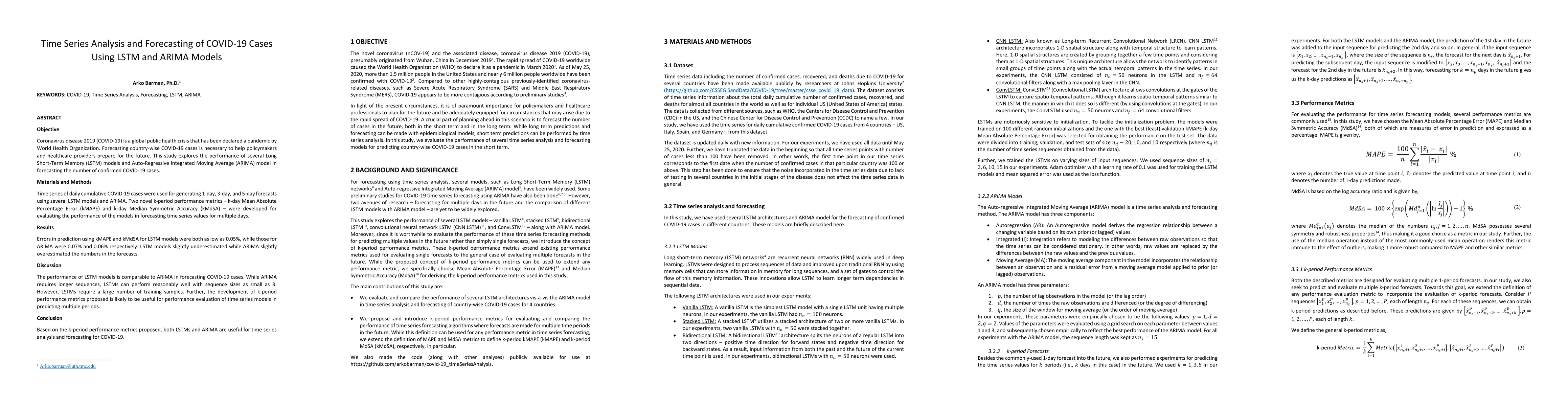 This study compares Long Short-Term Memory (LSTM) and Auto-Regressive Integrated Moving Average (ARIMA) models for forecasting COVID-19 cases, introducing novel k-day performance metrics. LSTM models show slightly lower prediction errors (0.05%) compared to ARIMA (0.07% and 0.06%), indicating both models' utility in COVID-19 time series analysis.