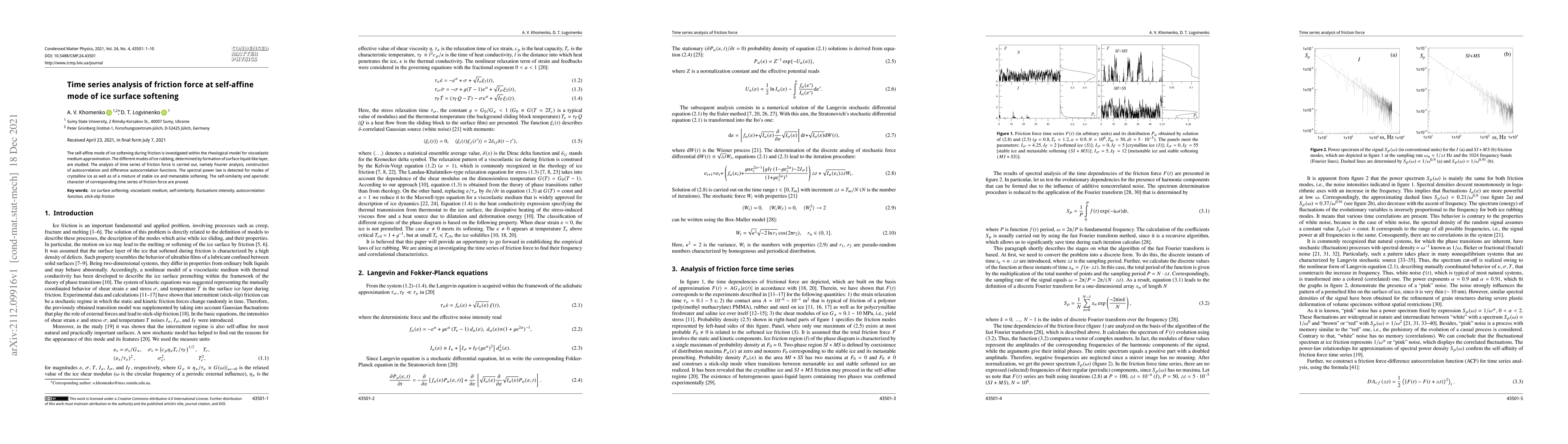 This paper investigates the self-affine mode of ice softening during friction using a viscoelastic medium approximation. Through Fourier analysis and construction of autocorrelation functions, it finds a spectral power law and proves the self-similarity and aperiodic nature of friction force time series in both crystalline ice and ice mixtures.