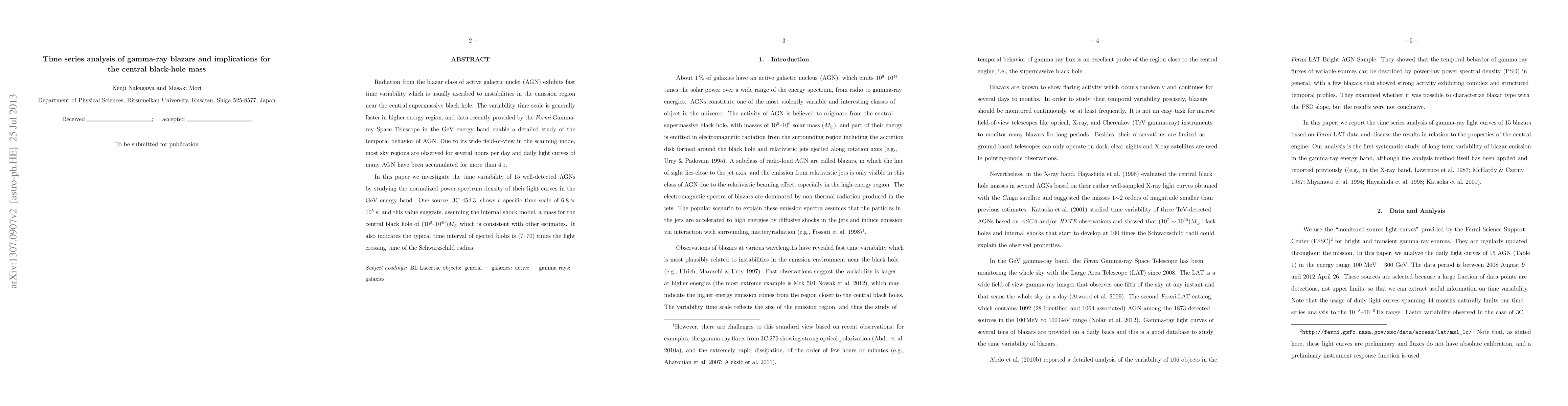 Radiation from the blazar class of of active galactic nuclei (AGN) exhibits fast time variability which is usually ascribed to instabilities in the emission region near the central supermassive black hole. The variability time scale is generally faster in higher energy region, and data recently provided by the {\it Fermi} Gamma-ray Space Telescope in the GeV energy band enable a detailed study of the temporal behavior of AGN. Due to its wide field-of-view in the scanning mode, most sky regions are observed for several hours per day and daily light curves of many AGN have been accumulated for more than 4 years. In this paper we investigate the time variability of 15 well-detected AGNs by studying the normalized power spectrum density (NPSD) of their light curves in the GeV energy band. One source, 3C 454.3, shows a specific time scale of $6.8\times10^5$ s, and this value suggests, assuming the internal shock model, a mass for the central black hole of $(10^8$--$10^{10})M_\odot$ which is consistent with other estimates. It also indicates the typical time interval of ejected blobs is $(7$--$70)$ times the light crossing time of the Schwarzschild radius.