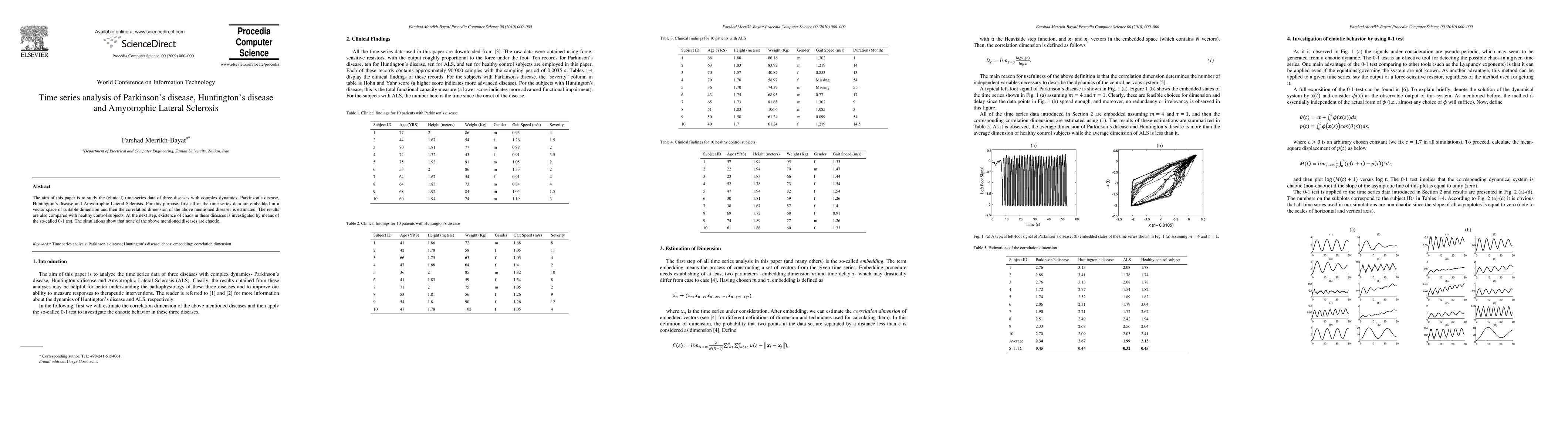 The aim of this paper is to study the (clinical) time-series data of three diseases with complex dynamics: Parkinson's disease, Huntington's disease and Amyotrophic Lateral Sclerosis. For this purpose, first all of the time series data are embedded in a vector space of suitable dimension and then the correlation dimension of the above mentioned diseases is estimated. The results are also compared with healthy control subjects. At the next step, existence of chaos in these diseases is investigated by means of the so-called 0-1 test. The simulations show that none of the above mentioned diseases are chaotic.