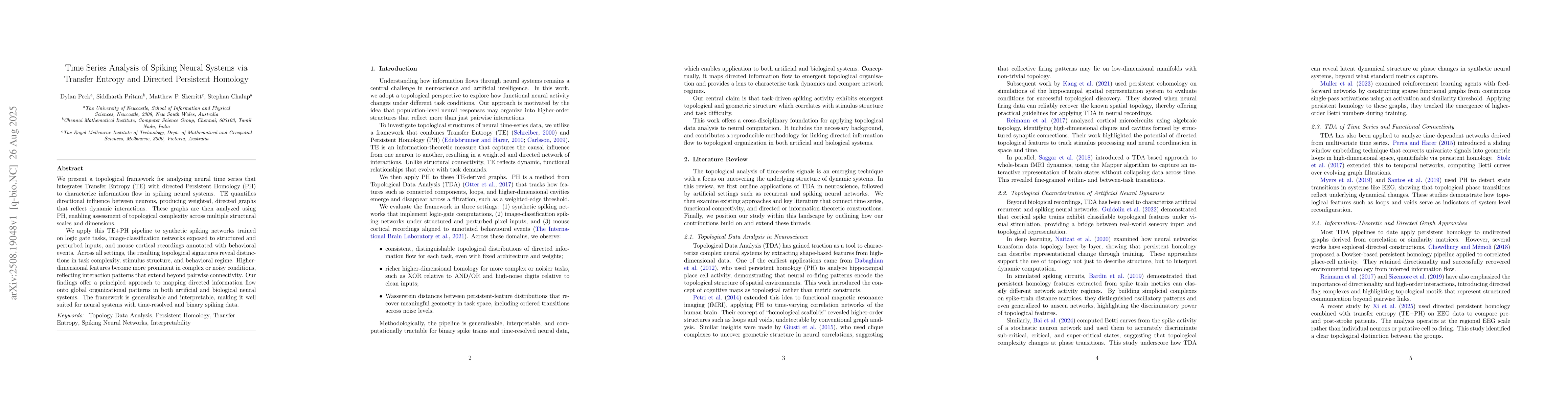 We present a topological framework for analysing neural time series that integrates Transfer Entropy (TE) with directed Persistent Homology (PH) to characterize information flow in spiking neural systems. TE quantifies directional influence between neurons, producing weighted, directed graphs that reflect dynamic interactions. These graphs are then analyzed using PH, enabling assessment of topological complexity across multiple structural scales and dimensions. We apply this TE+PH pipeline to synthetic spiking networks trained on logic gate tasks, image-classification networks exposed to structured and perturbed inputs, and mouse cortical recordings annotated with behavioral events. Across all settings, the resulting topological signatures reveal distinctions in task complexity, stimulus structure, and behavioral regime. Higher-dimensional features become more prominent in complex or noisy conditions, reflecting interaction patterns that extend beyond pairwise connectivity. Our findings offer a principled approach to mapping directed information flow onto global organizational patterns in both artificial and biological neural systems. The framework is generalizable and interpretable, making it well suited for neural systems with time-resolved and binary spiking data.