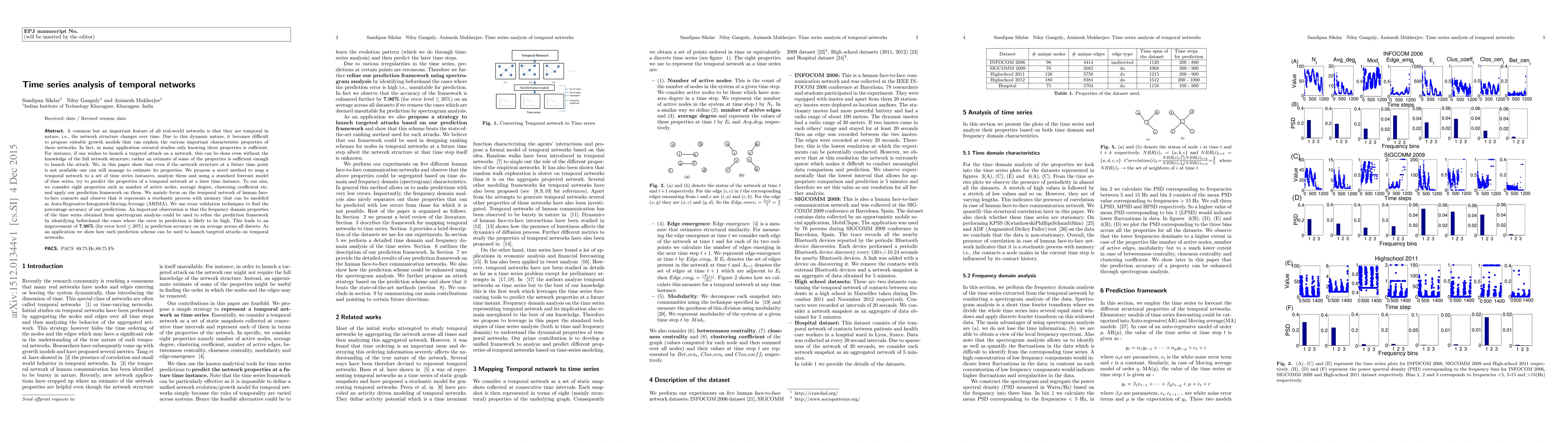 This paper proposes a novel method to predict properties of temporal networks by mapping them to time series and using ARIMA models for forecasting. It demonstrates improved prediction accuracy by incorporating frequency domain properties from spectrogram analysis, achieving a 7.96% improvement in error-level predictions.