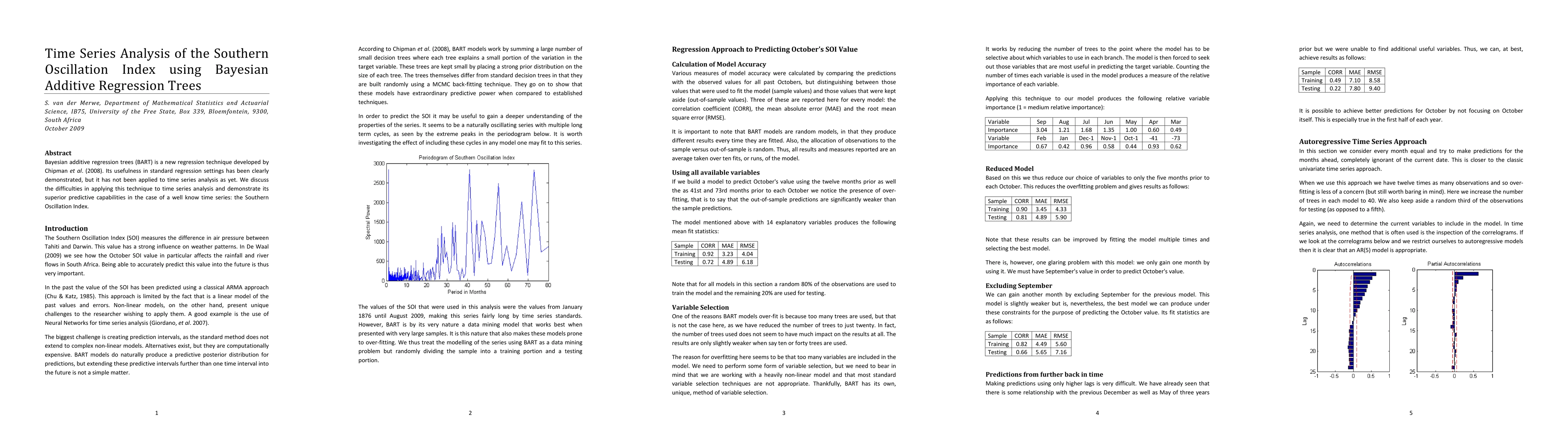 This paper explores the application of Bayesian additive regression trees (BART) to time series analysis, specifically for predicting the Southern Oscillation Index, demonstrating BART's superior predictive capabilities compared to traditional methods.
