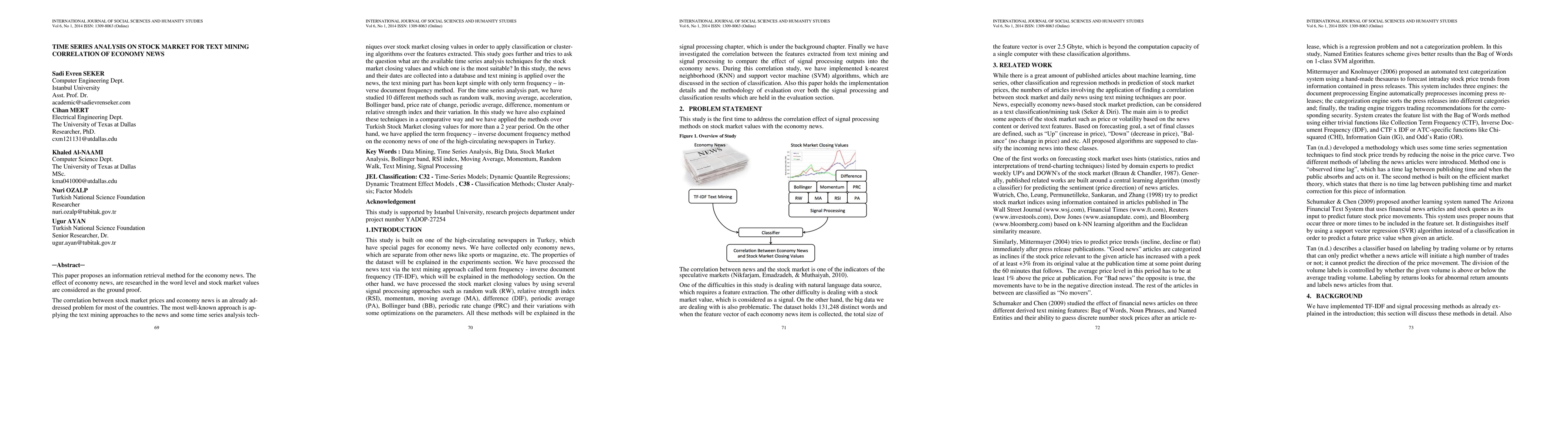This paper explores the correlation between economy news and stock market prices using text mining and various time series analysis techniques on Turkish Stock Market data. It evaluates 10 time series methods and applies them to a two-year dataset, comparing their effectiveness in predicting market trends.