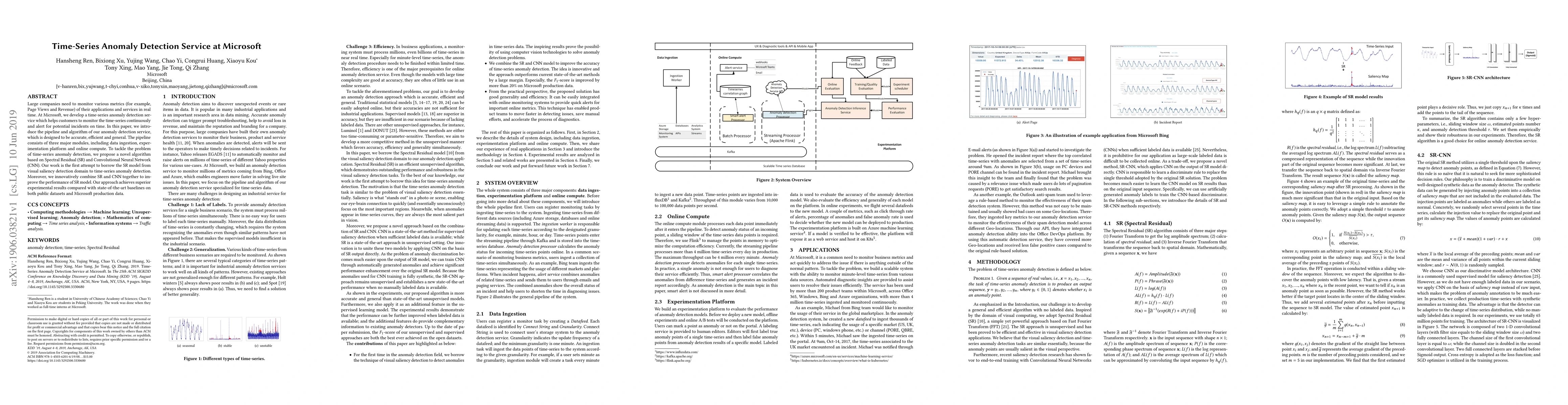 Microsoft developed a time-series anomaly detection service to monitor application metrics in real time. The service employs a Spectral Residual (SR) and Convolutional Neural Network (CNN) hybrid algorithm, which outperforms existing methods on both public datasets and Microsoft's production data.