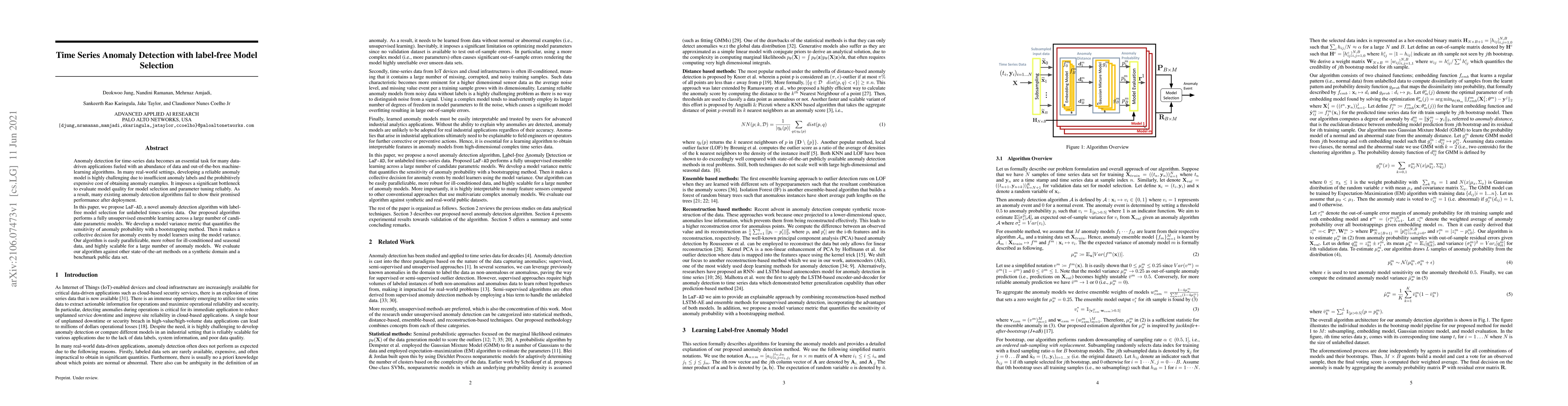 This paper introduces LaF-AD, an unsupervised anomaly detection algorithm for time-series data that selects models without requiring anomaly labels. It employs ensemble learning and a model variance metric to identify anomalies, demonstrating robustness and scalability across various datasets.